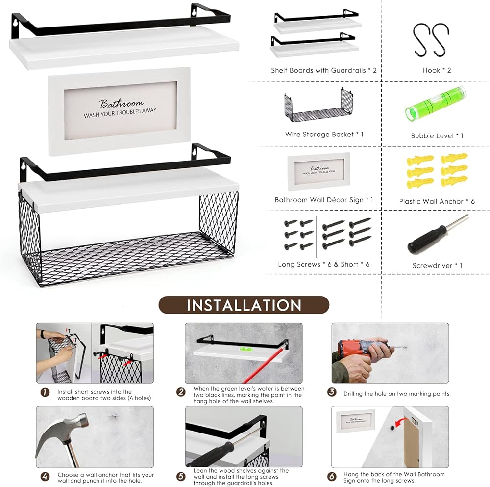 [التثبيت دون أي قلق أو ضمان] - تتضمن العبوة دليل تركيب واضح، ولوحتين رفوف مع قضبان حماية معدنية مثبتة، وسلة تخزين سلكية، وديكور حائط للحمام، وخطافين، وأجهزة. لا يستغرق الأمر سوى بضع دقائق لاتباع التعليمات وإكمال التثبيت، ثم يمكنك تنظيم مساحة التخزين الخاصة بك على الحائط. أبعاد الرف: 40.64 سم طولًا × 15.24 سم عرضًا. نحن ملتزمون بمعالجة أي مشكلات في المنتج، إذا كانت لديك أي مشكلة، فقط اتصل بنا للحصول على المساعدة أو استبدال مجاني