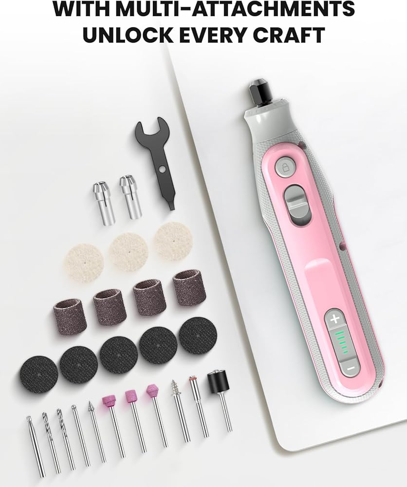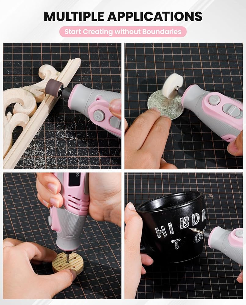 • 【UPGRADED MOTOOR WITH MORE POWER】 The power rotary tool is equipped with an upgraded motor that unleashes immense power, making it an ideal choice for your diverse DIY endeavors. Whether it's the carving, sanding, grinding, polishing, or clean cutting of handicrafts, this cordless rotary tool Provide stronger power. Particularly in the crafting of resin works, its outstanding performance shines through, ensuring every creation meets standards