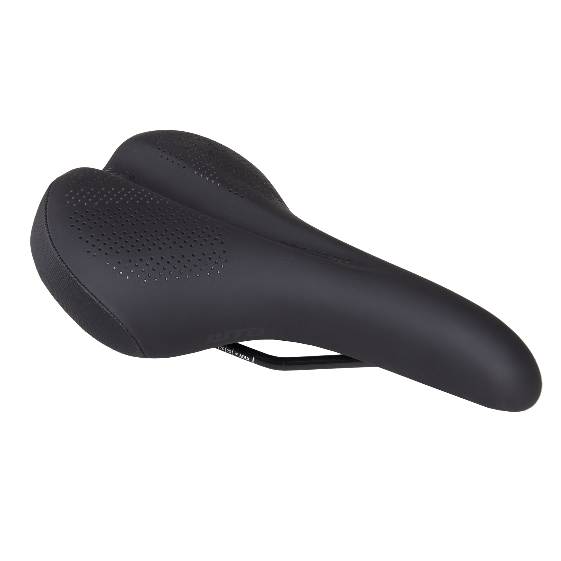 The WTB Volt Mountain Bike Saddle is a proven favorite among riders worldwide, designed for both speed and comfort. Its contoured shape locks you into position, while the upward curved tail and gently dropped nose provide a platform for powerful pedaling. The Flex-Tuned shell combined with medium-level DNA padding offers the perfect balance of support and performance, ensuring a smooth, responsive ride. The Comfort Zone centerline cutout relieves pressure from sensitive areas, enhancing long-term comfort on every trail. The saddle's Microfiber Cover replicates the feel of leather, providing durability, antimicrobial benefits, and cruelty-free peace of mind. Weighing only 165g and featuring strong carp rails, the Volt is lightweight yet built to handle rigorous mountain biking conditions. Whether you're tackling steep climbs or rugged terrain, the WTB Volt delivers the comfort, support, and durability you need for every adventure.