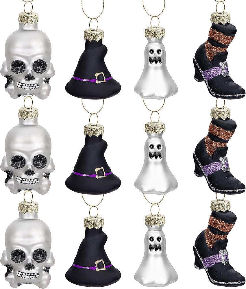 12 قطعة من زخارف يوم الموتى الزجاجية المعلقة - زخارف جمجمة السكر Dia De Los Muertos - رأس هيكل عظمي معلق للهالوين لتزيين شجرة عيد الميلاد والهالوين (12 قطعة قبعة)