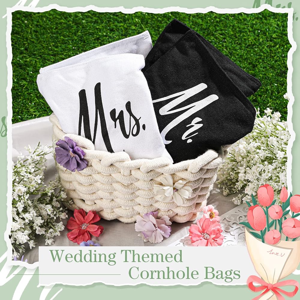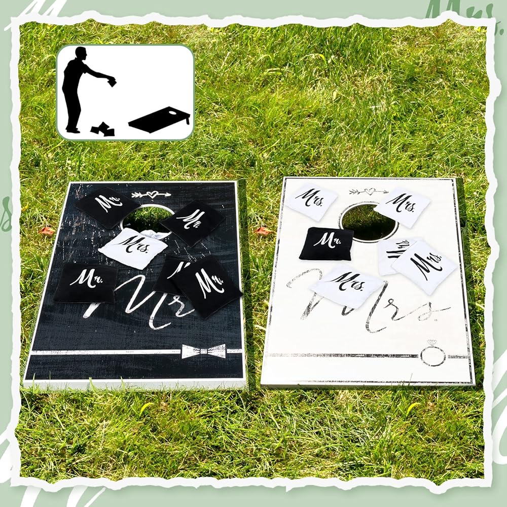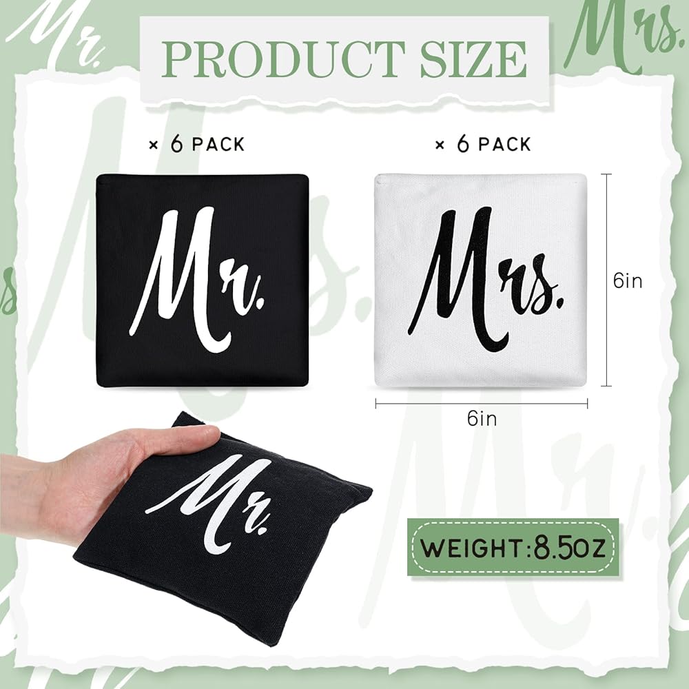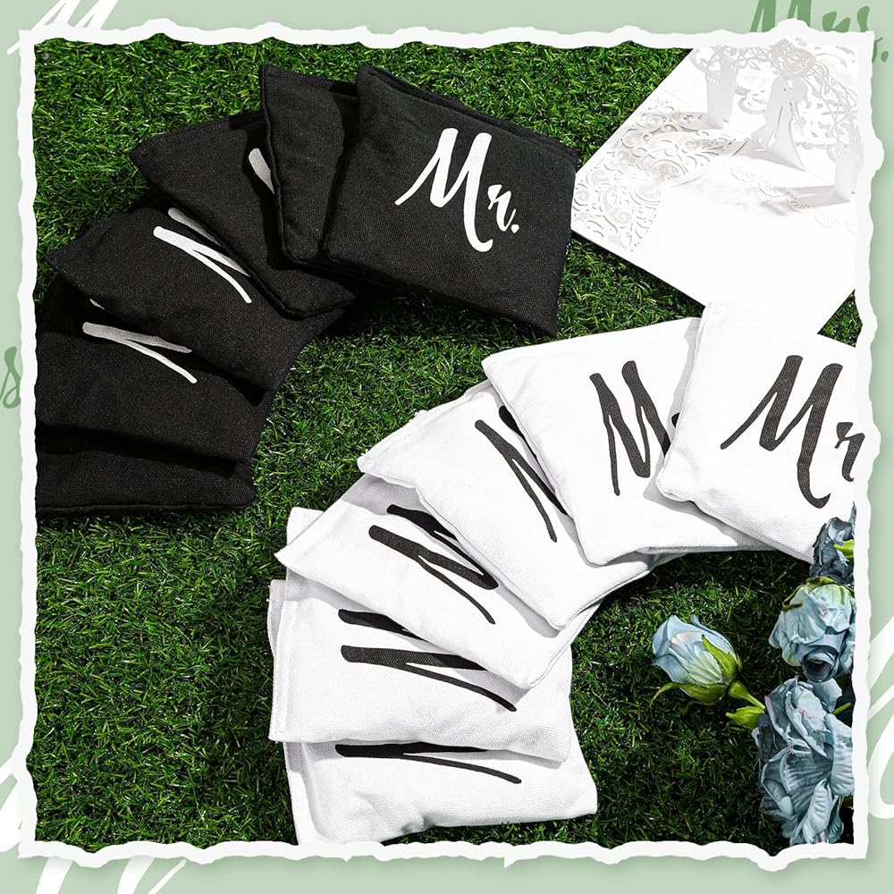 Wedding Themed Design: the corn hole bean bags are the ideal finishing touch to many wedding ceremonies, the black and white bags are printed with Mr. and Mrs. in a classic font respectively, ideal for photos and receptions; These words printed on the bag not only have an elegant feel to them but also ensure that your wedding guests can quickly identify their bags, practical and decorative
