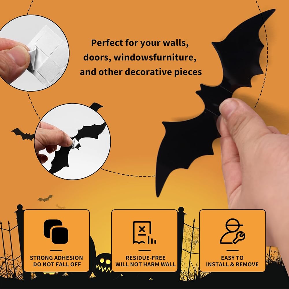 【ديكور رعب لغرفة نوم الهالوين 】 مصنوعة من بولي كلوريد الفينيل الأسود المتين عالي الجودة، ملصقات الخفافيش هذه سميكة ومتينة، وسادة لزجة غير سامة، آمنة ولا طعم لها، وتدوم لفترة طويلة. يمكن تخزين هذه الزخارف وإعادة استخدامها عامًا بعد عام.