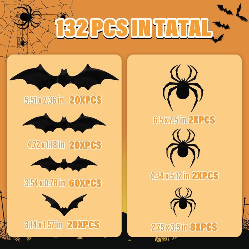【عبوة مطورة بالحجم】مجموعة الخفافيش والعنكبوت المزخرفة للهالوين مكونة من 132 خفاشًا مخيفًا في 7 أحجام مختلفة. عنكبوت 2 قطعة 6.5 بوصة × 7.5 بوصة، 2 قطعة 4.3 بوصة × 5.1 بوصة، 8 قطعة 2.75 بوصة × 3.35 بوصة/خفافيش 20 قطعة 6.3 بوصة × 1.5 بوصة، 20 قطعة 4.7 بوصة × 1.1 بوصة، 60 قطعة 3.5 بوصة × 0.7 بوصة، 20 قطعة 3.1 بوصة × 1.6 بوصة . اصنع "إكليل الهالوين" الخاص بك "كهف الخفافيش والعنكبوت" باستخدام هذه الخفافيش اللباد ثلاثية الأبعاد المخيفة للجدار، في جميع أنحاء الجدار أو النافذة!