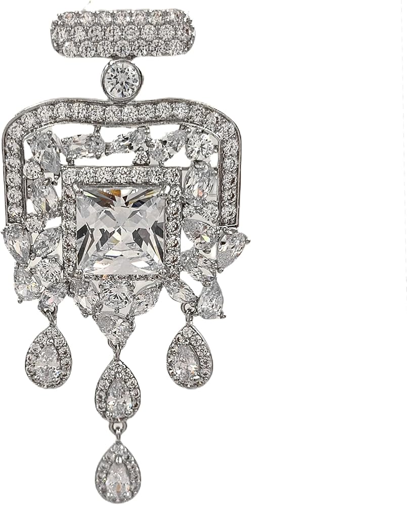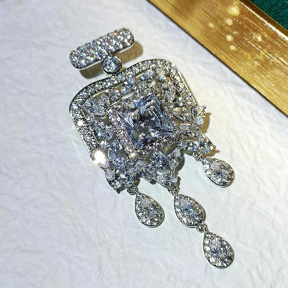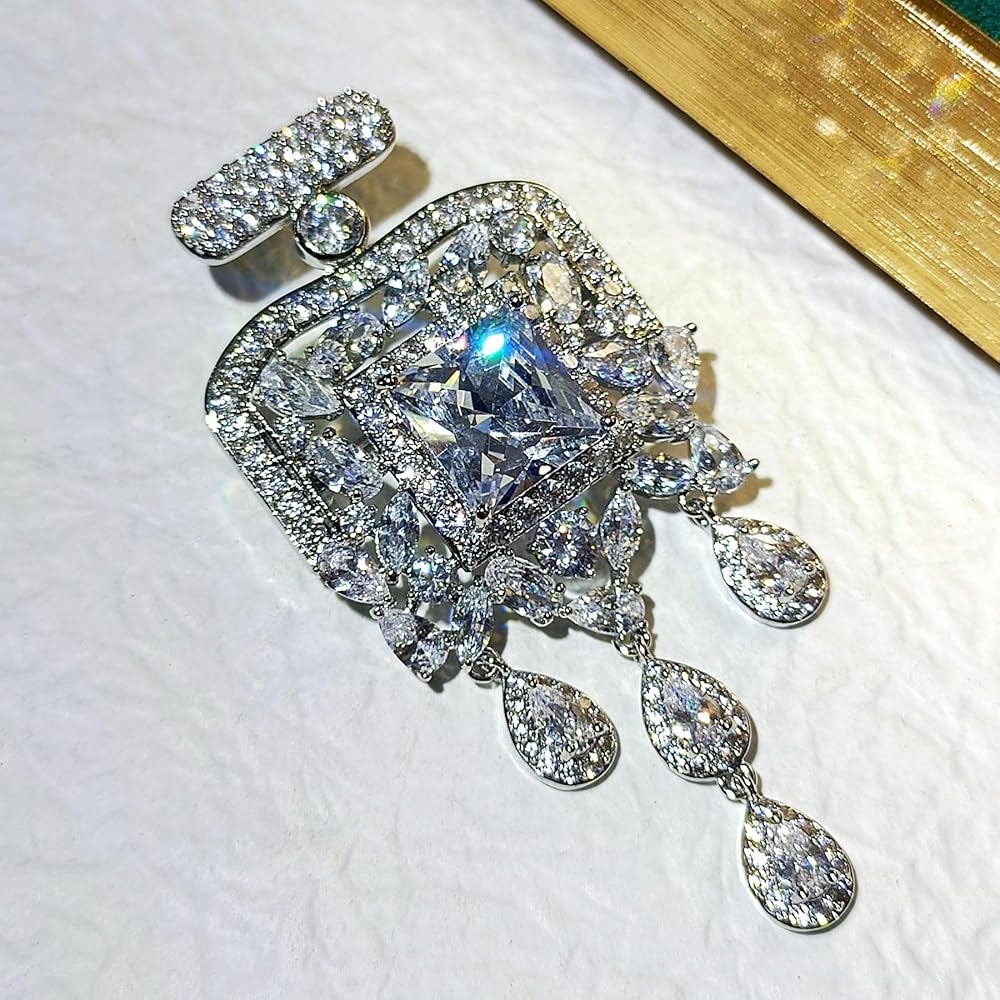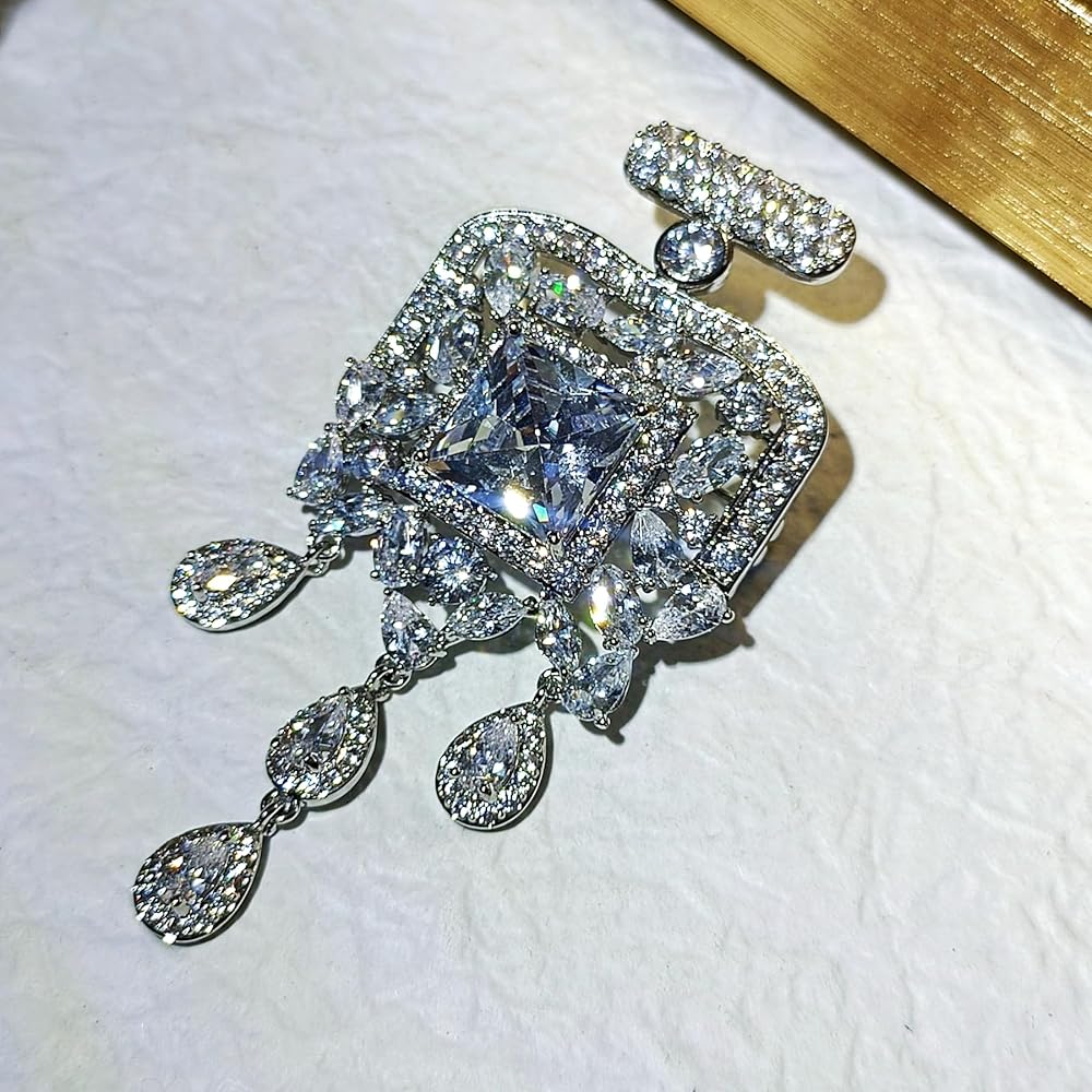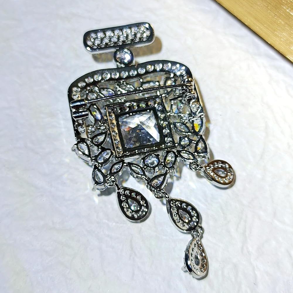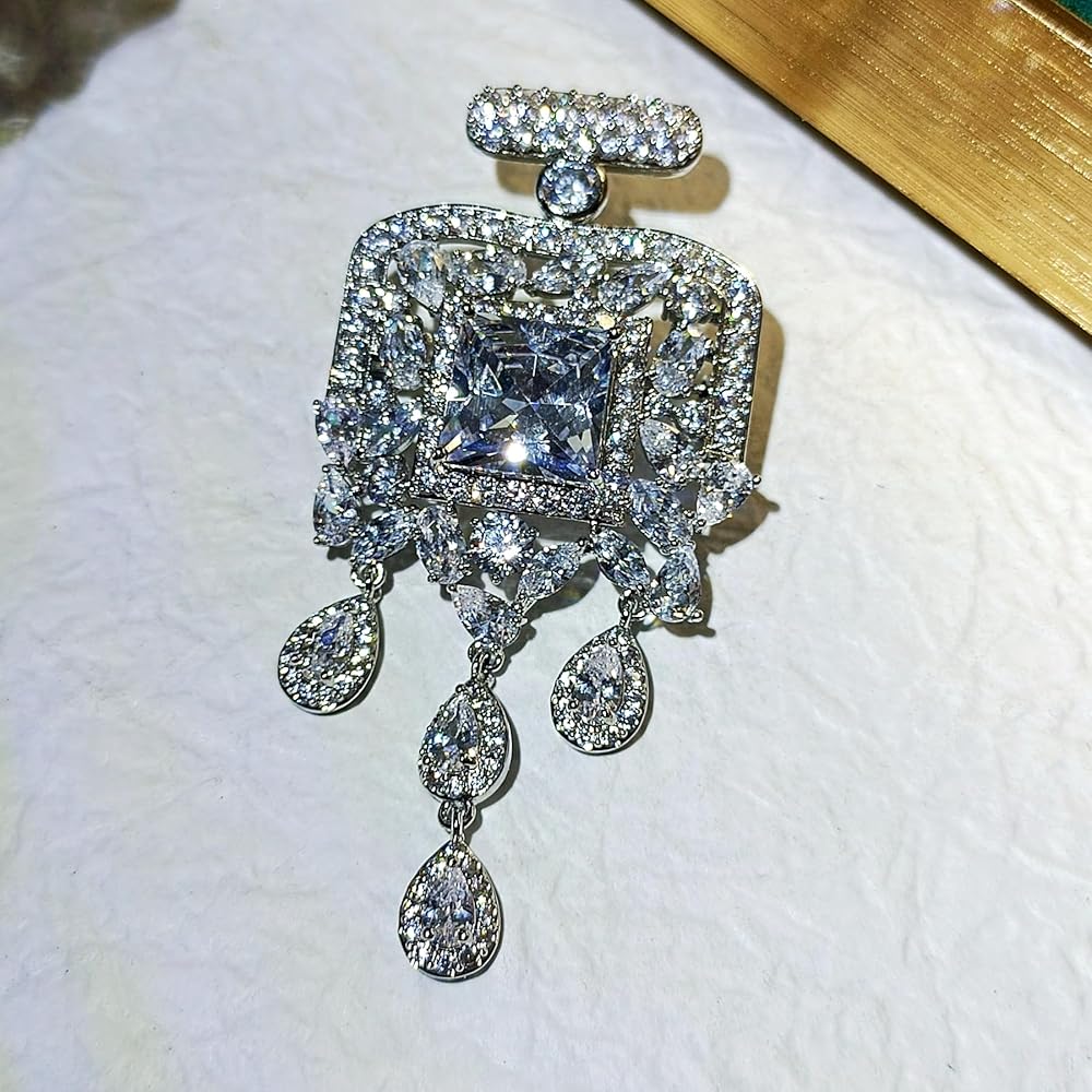 Inspired by the legendary perfume bottle that transforms the world into a sparkling wonderland, this pin is a stunning piece of jewelry. It features a silver tone plated bottle shape with a dazzling cap of pave cz stones and a faceted square stone in the center. Surrounding the square stone are pear, marquise, baguette and round cz stones that create a brilliant cluster effect. The pin also has three tear-shaped drops that cascade from the bottle, that is the scent of a drop from the legendary perfume bottle turns the world into a diamond shine. adding movement and charm. This pin is a perfect accessory for anyone who loves fashion and glamour