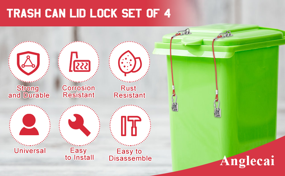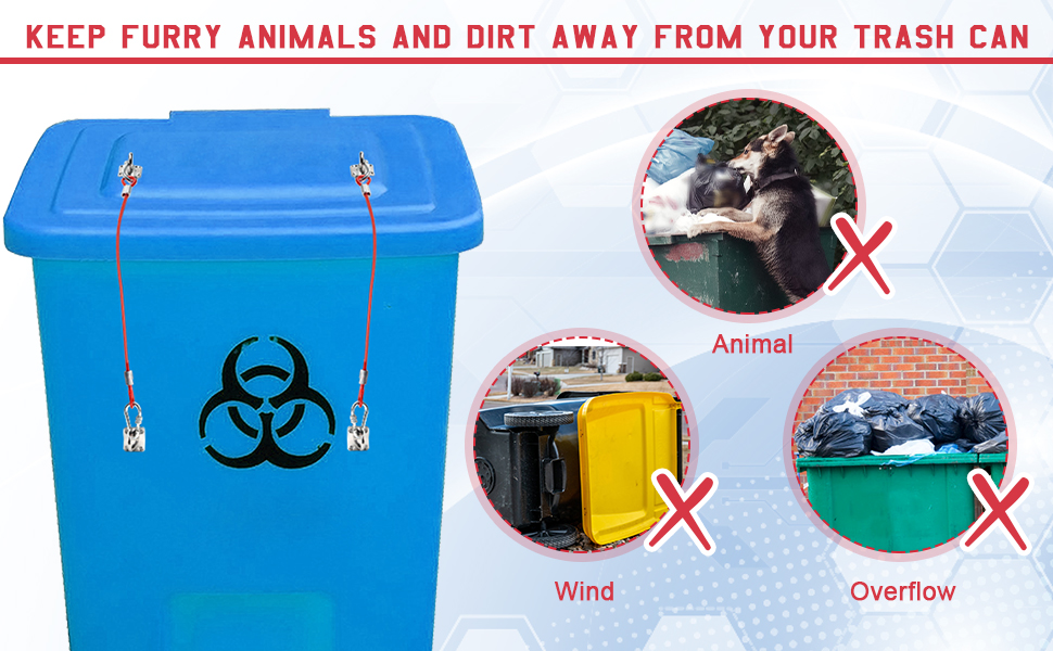 【 منع فعال من فوضى القمامة 】 يمنع قفل صندوق القمامة بشكل فعال الحيوانات البرية غير المرغوب فيها من استكشاف صندوق القمامة الخاص بك، ويحافظ على نظافة البيئة المحيطة. يضمن المقبض الثقيل والمتين عدم رفع غطاء صندوق القمامة بواسطة الحيوانات، ويمنع قلب القمامة في كل مكان.