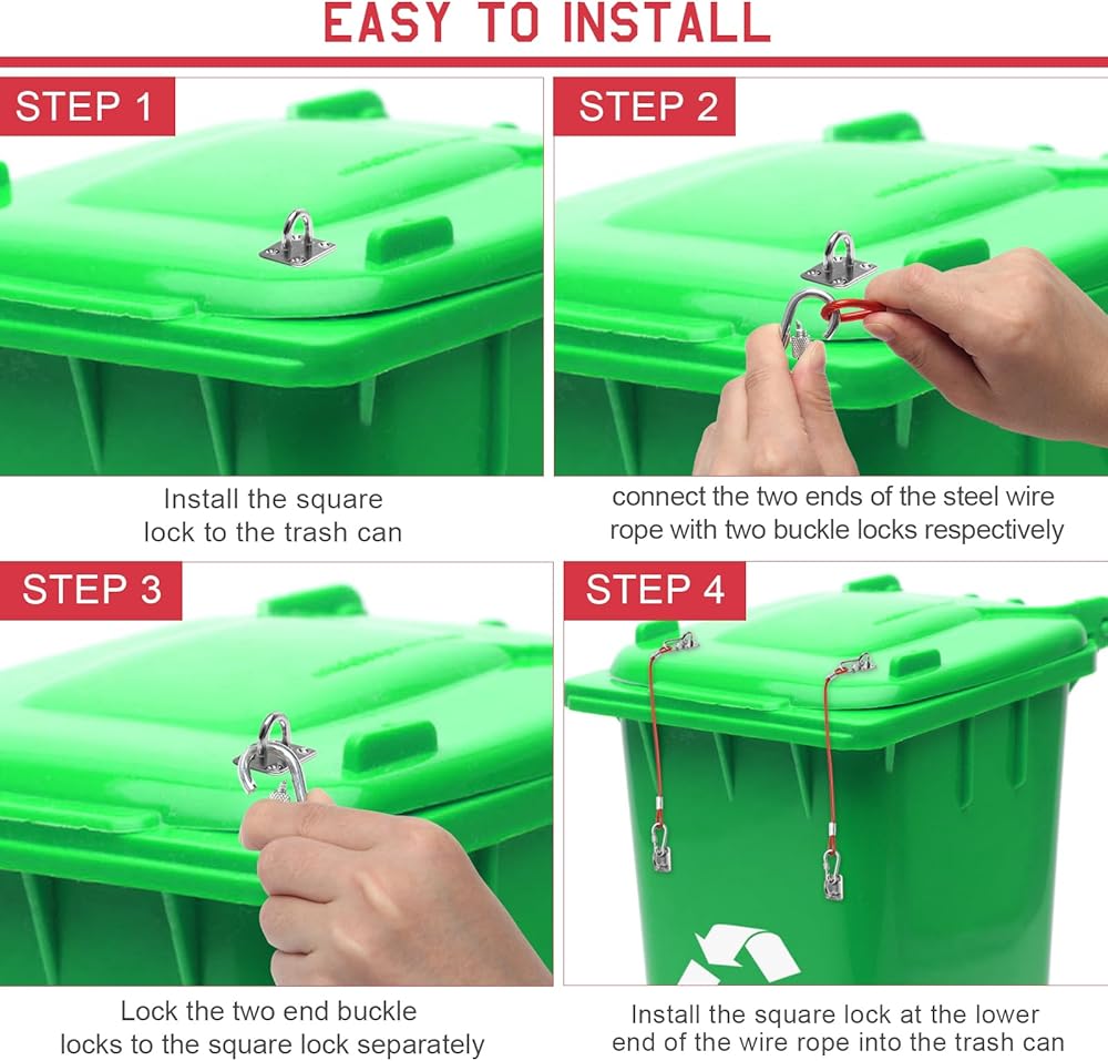 【سهلة الفك والتركيب】أولاً، قم بثقب فتحات سلة المهملات، ثم قم بتثبيت لوحة الفتحة المربعة على سلة المهملات، ثم قم بتوصيل حبل السلك الفولاذي ولوحة الفتحة المربعة بقفل الإبزيم. بسيطة ومريحة، دون إعاقة إفراغ سلة المهملات.