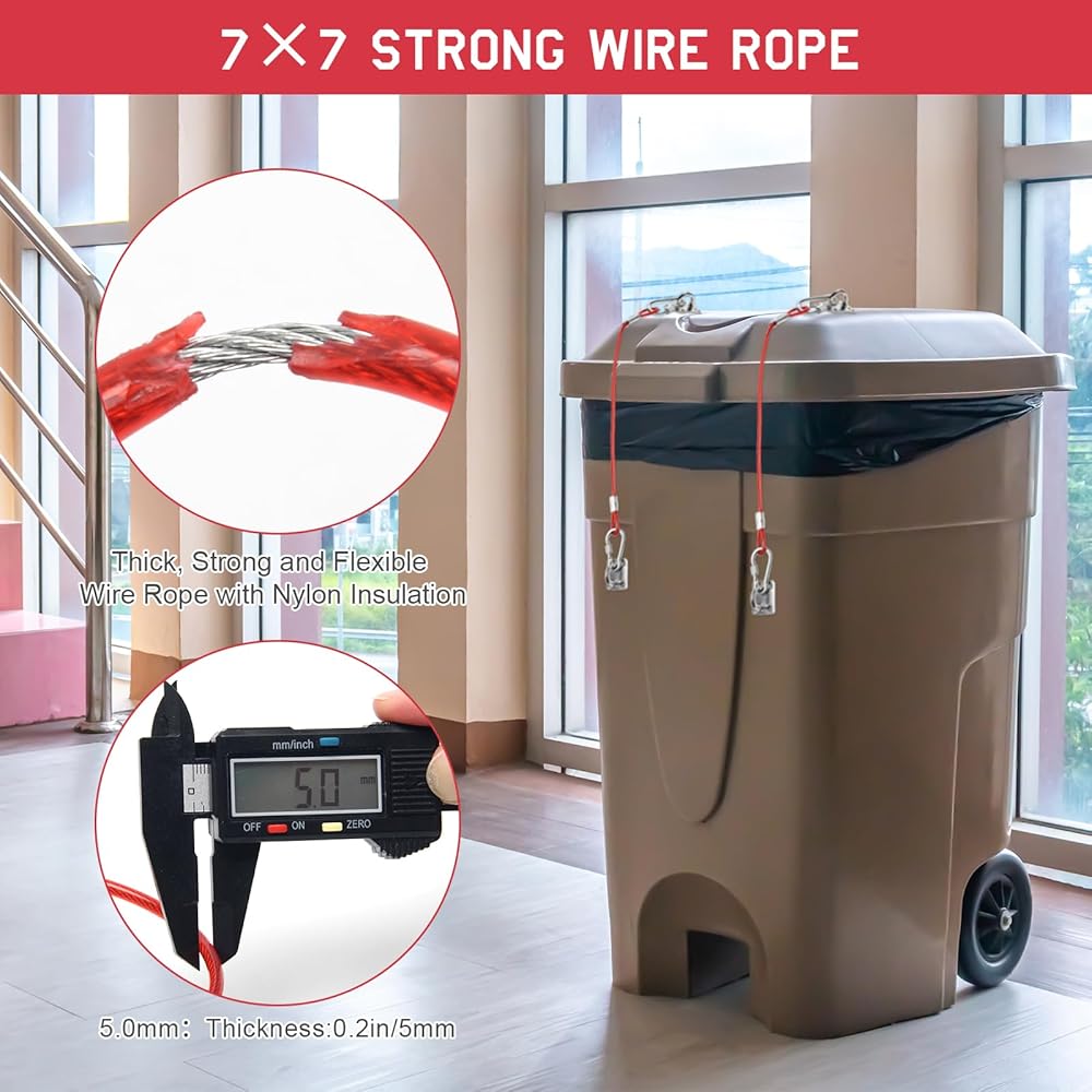 【حبل سلك فولاذي متين وشديد التحمل】قفل علبة القمامة هذا مصنوع من حبل سلكي فولاذي مطلي بالمطاط القوي والفولاذ المقاوم للصدأ، ويمكنه تحمل البيئات الطبيعية القاسية في الهواء الطلق، والتعامل الخشن، وتآكل الحيوانات.