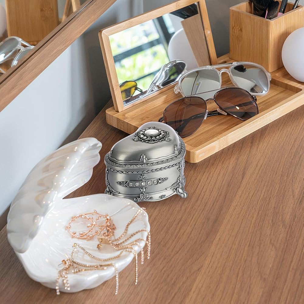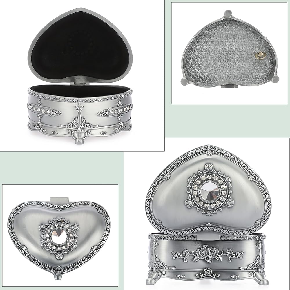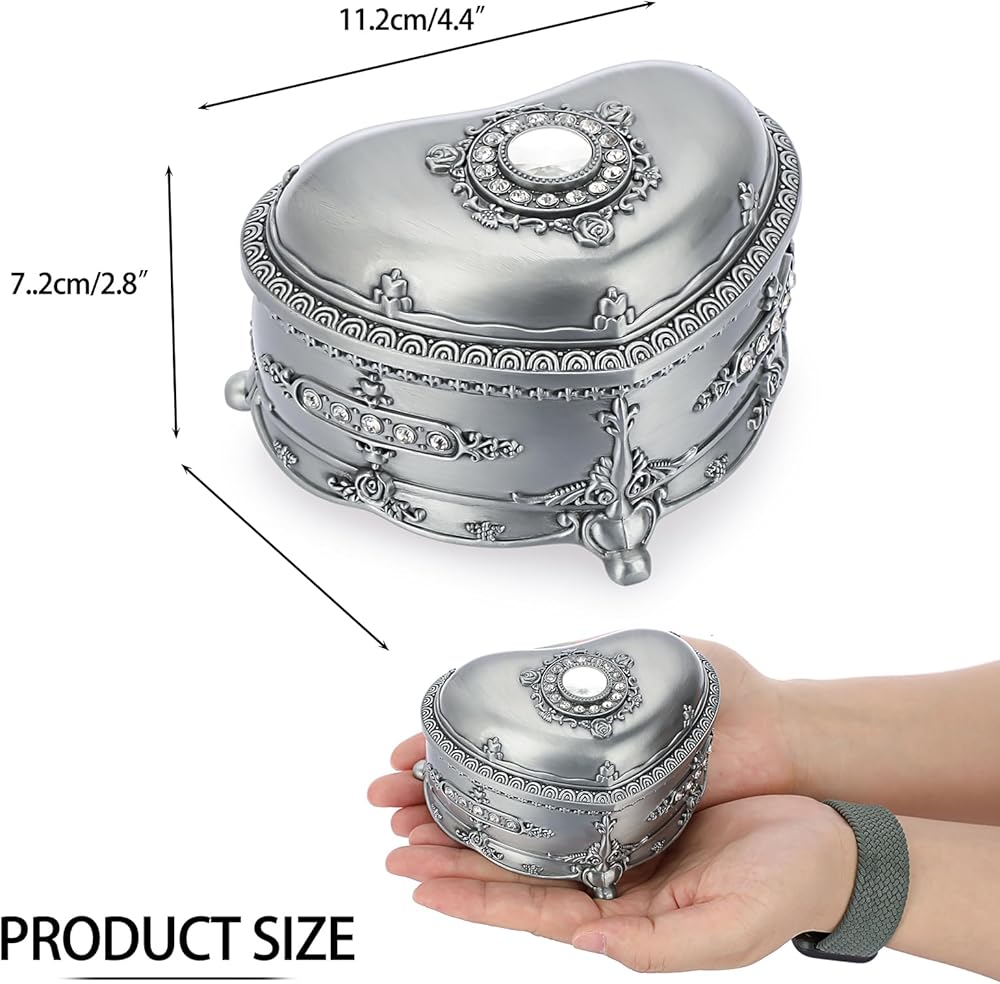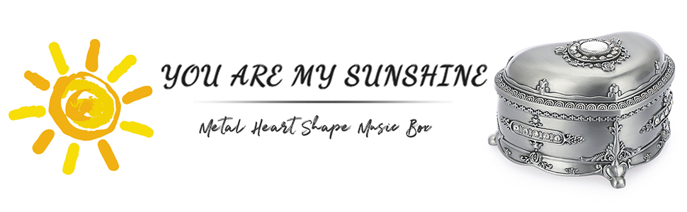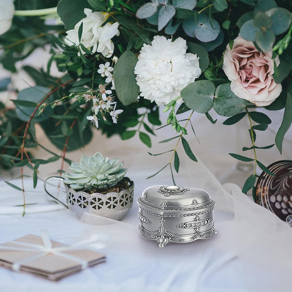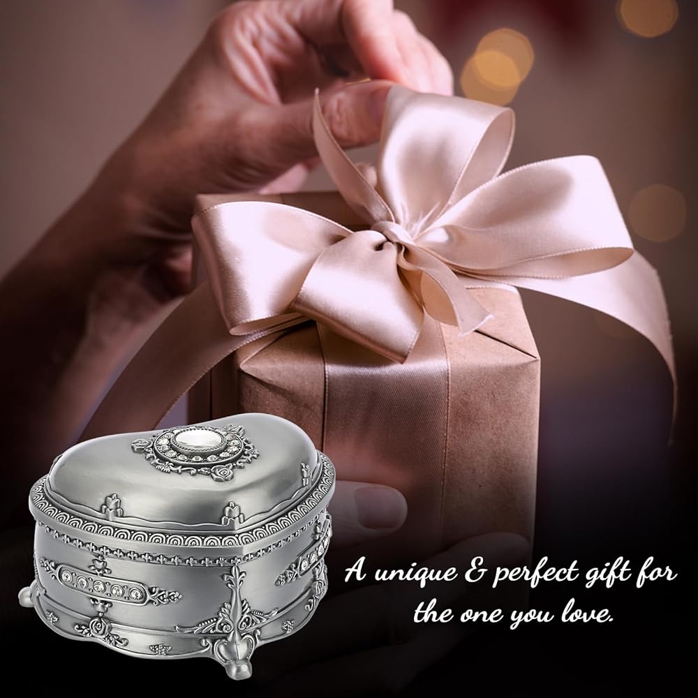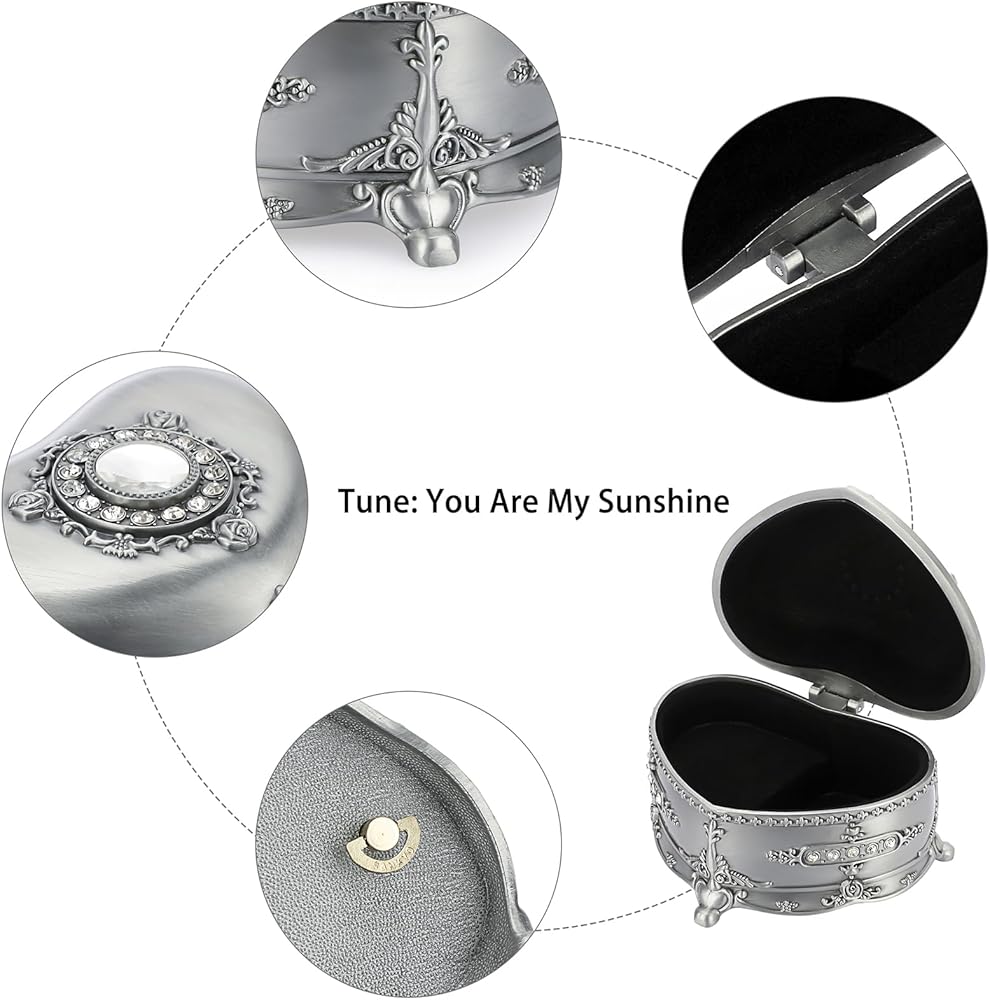 صندوق موسيقى عتيق من ELLDOO، صندوق مجوهرات موسيقي على شكل قلب معدني فضي، صندوق تذكار، صندوق تخزين مجوهرات صغير هدية للفتيات والنساء (اللحن: You are My Sunshine)