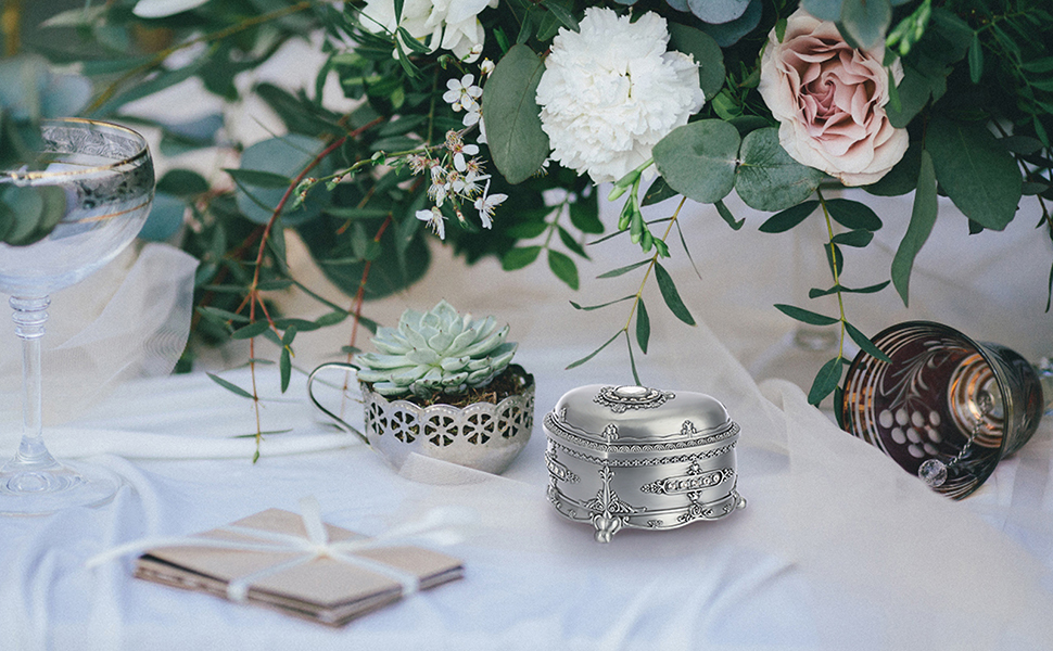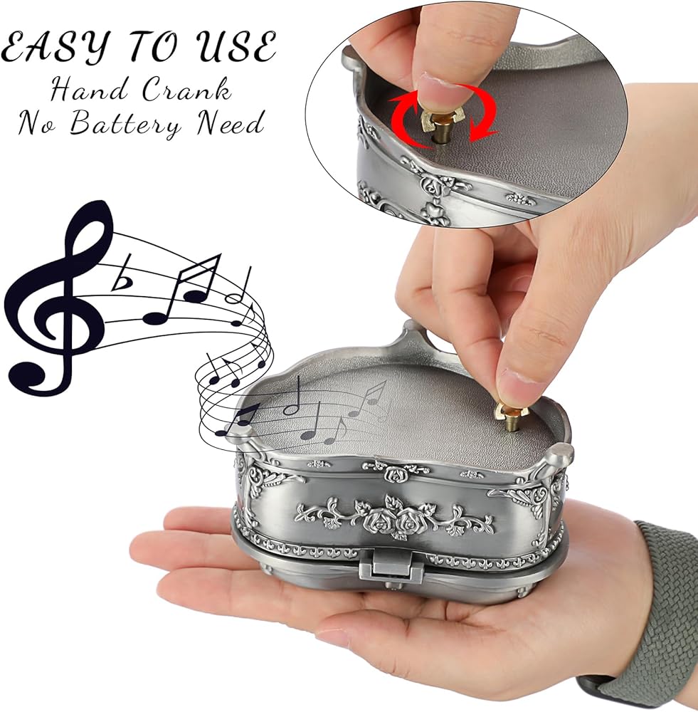 ♬♥ تصميم رومانسي وفريد من نوعه - صندوق الموسيقى هذا مصنوع من معدن فضي عالي الجودة، قوي ومتين. تصميم على شكل قلب وسطح مزين بنمط الورد وأحجار الراين، مما يجعل صندوق الموسيقى أكثر تميزًا ورومانسيًا.