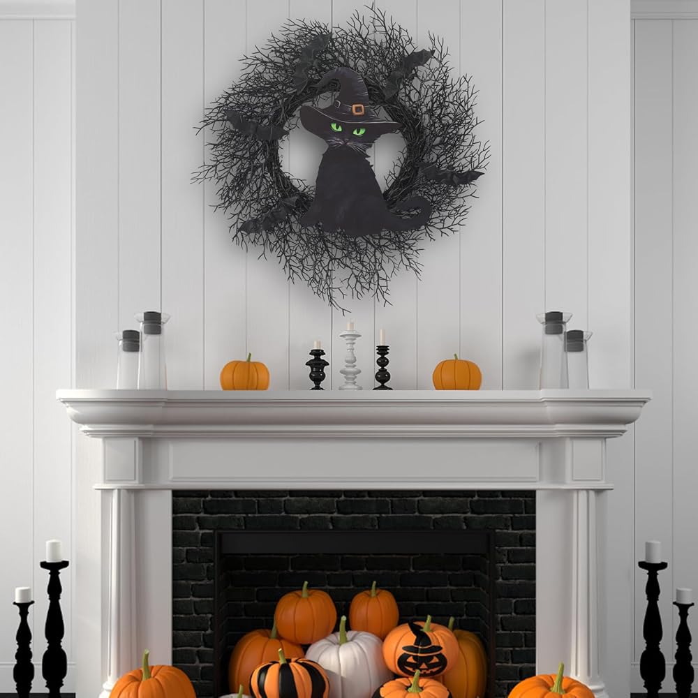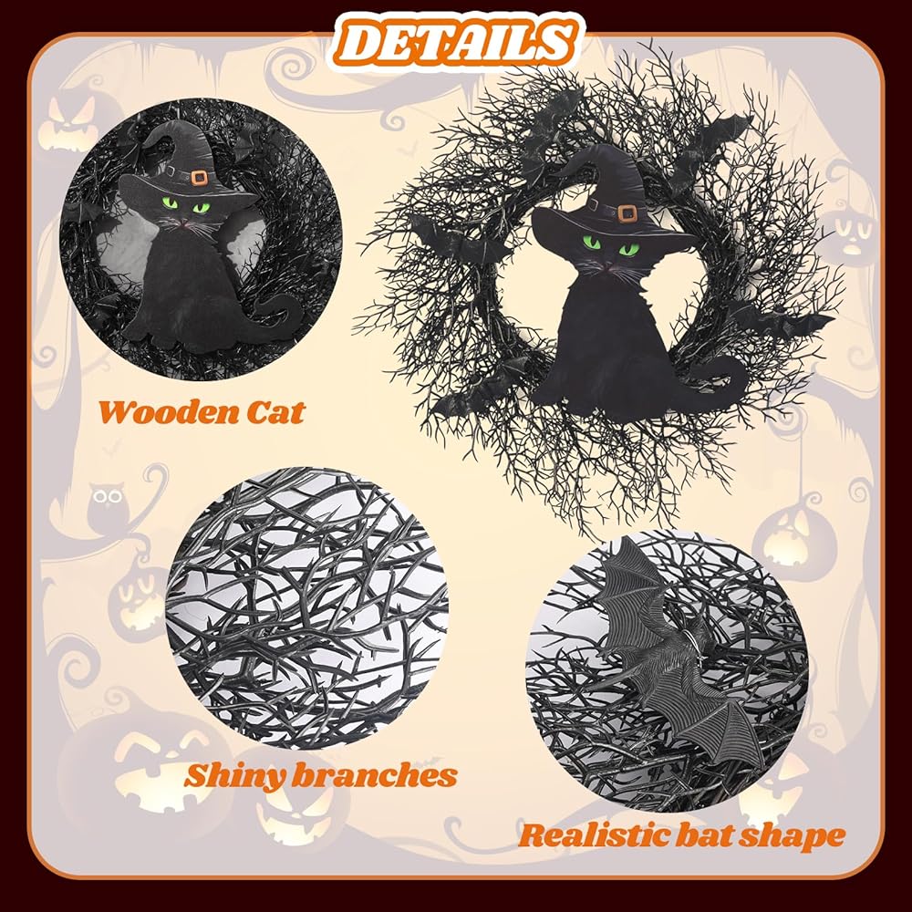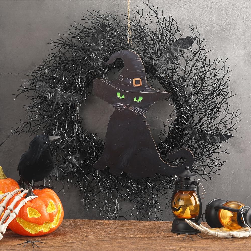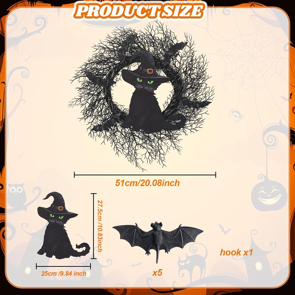【قطة سوداء فريدة من نوعها مع لمسة خفاش】: يتميز إكليل الهالوين هذا بمقاس 20 بوصة بقطة سوداء غامضة كقطعة مركزية، مع شكل قطة سوداء خشبية نابضة بالحياة وعيون خضراء متلألئة تبدو وكأنها تحرس باب منزلك. تم تزيين الإكليل بالعديد من الخفافيش السوداء التي تبدو وكأنها ترفرف في سماء الليل، مما يضيف الحركة والطاقة إلى الإكليل بأكمله. دع كل من يأتي إلى منزلك يشعر بنكهة الهالوين القوية.