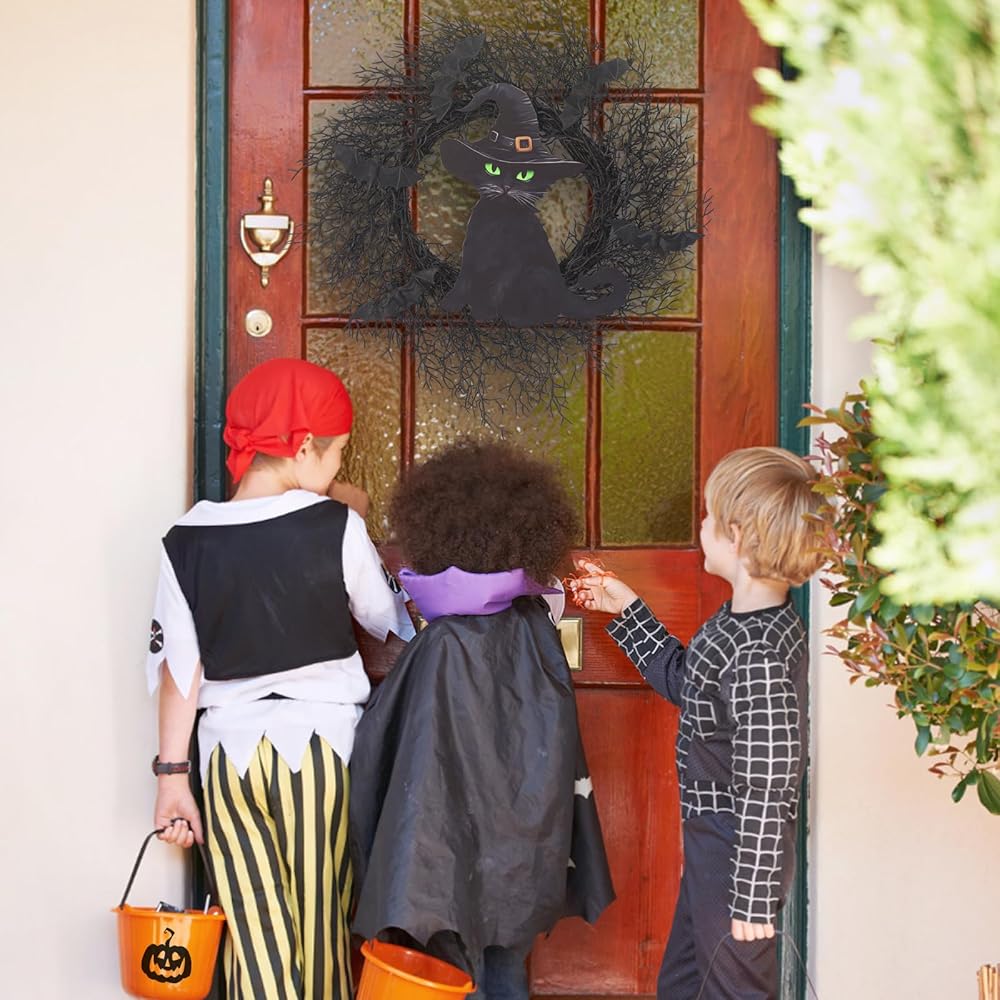 【ديكور الهالوين】: ديكور الهالوين للقطط السوداء مناسب للباب الأمامي، والشرفة الأمامية، وغرفة المعيشة، والمدفأة، والخزائن، والجدران، والنوافذ، والأرفف، ودعائم الصور، وحفلات الهالوين، وديكورات الهالوين الداخلية والخارجية وما إلى ذلك. قم بتعليق هذا الإكليل الأسود الفريد على باب منزلك الأمامي لتحية الخدعة أو الحلوى وإبهار ضيوفك! خذك أنت وضيوفك إلى عالم الهالوين المخيف!
