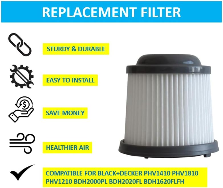 • Compatibility: The PVF110 Filter Replacement is designed for Black+Decker 20V Max Lithium Handheld Vacuum Cleaner models PVF110, PVF1820, PHV1210, and PHV1810. It serves as a reliable filter replacement, ensuring compatibility with popular Black and Decker models. Part numbers include 90552433 and 90552433-01.
