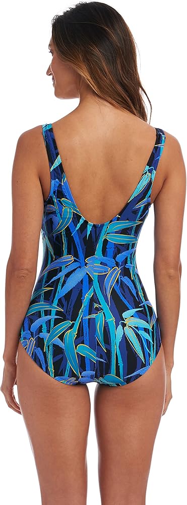 DESIGNER SUMMER SWIMWEAR — Made for ship-to-shore adventures, this tropical-inspired bamboo print one-piece features over-the-shoulder straps and a modest cut front and back.