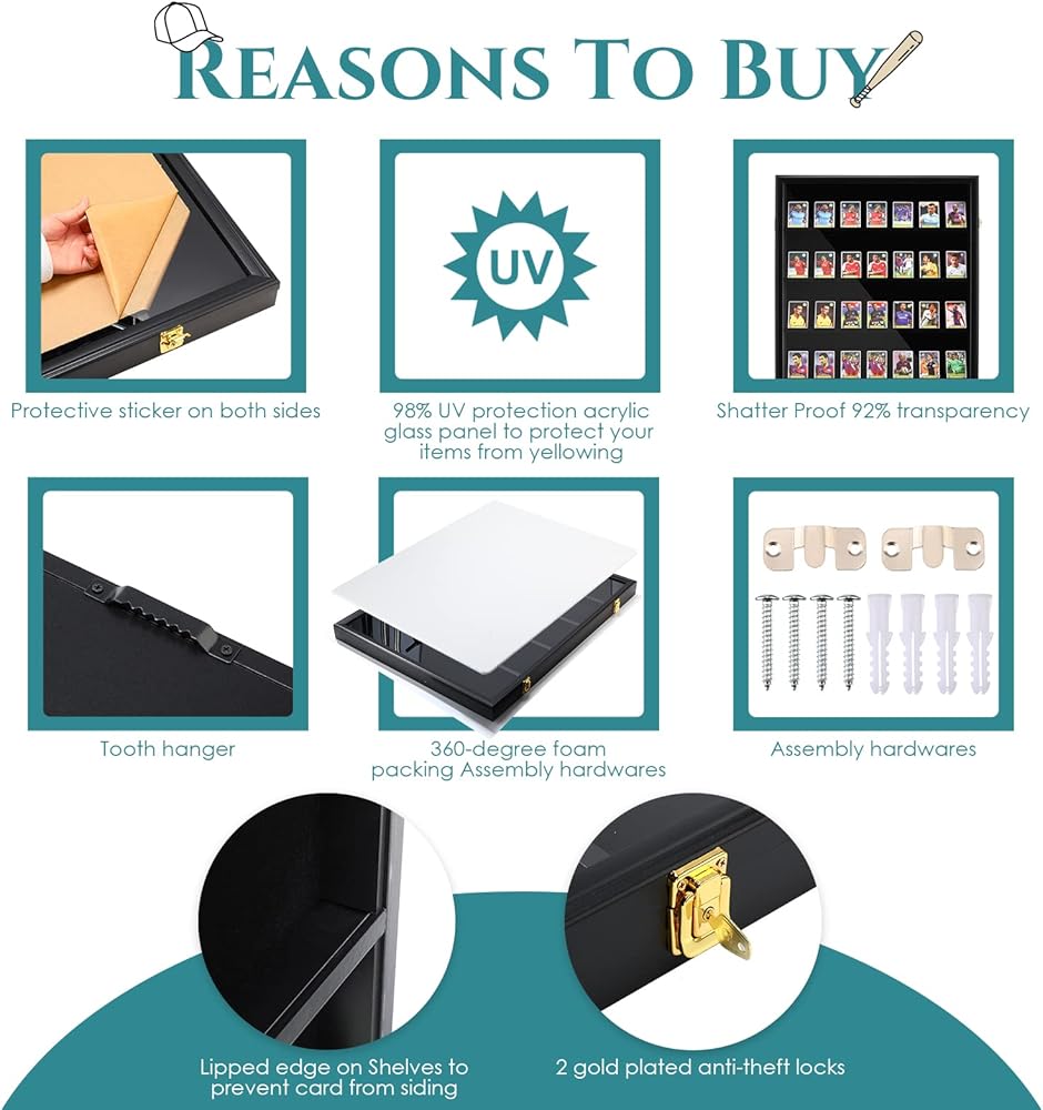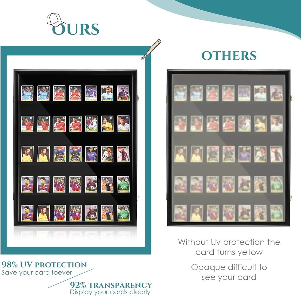 This sports card wall display has 98% UV protection ability, which can prevent the card from fading and aging due to sunlight, and keep your cards in bright colors.