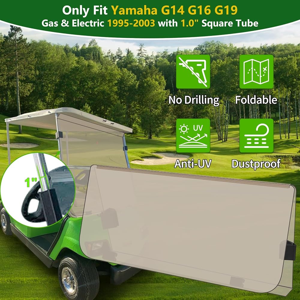 Fits Models: The golf cart windshield only fits 1995-2003 Yamaha G14 G16 G19 gas & electric models and only fits 1"×1" front struts rail. Confirm the year, make, model and rail size of your golf cart before purchasing. (Will Not Fits Yamaha G2, G8, G9, G22, G29, Drive, Drive2, YDR, Adventurer and UMAX Rally 4×4 models.)