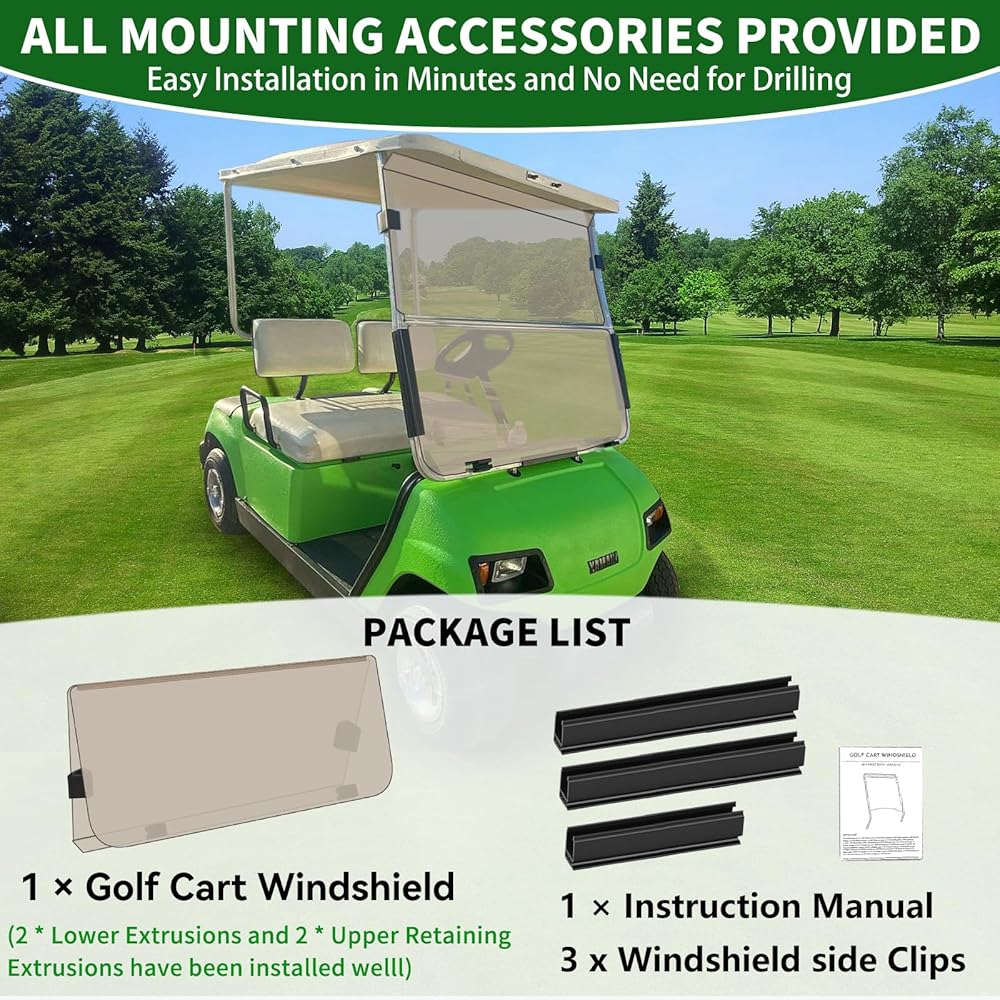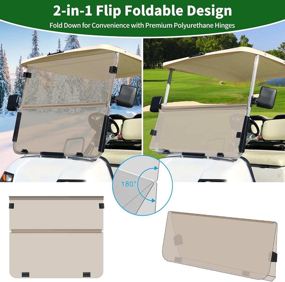 Multi-Functional Folding Golf Cart Windshield: The superior quality of acrylic protects the windshield from shattering and cracking. It protects your face during winter or cold conditions. It does not rattle and bounce during travel along the golf course. Such a great addition to your golf cart! It provides longer use than other windshields that use an adhesive tape connection.
