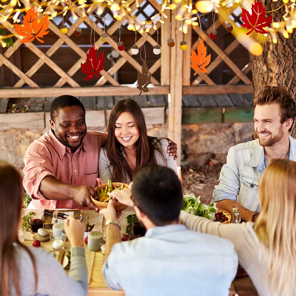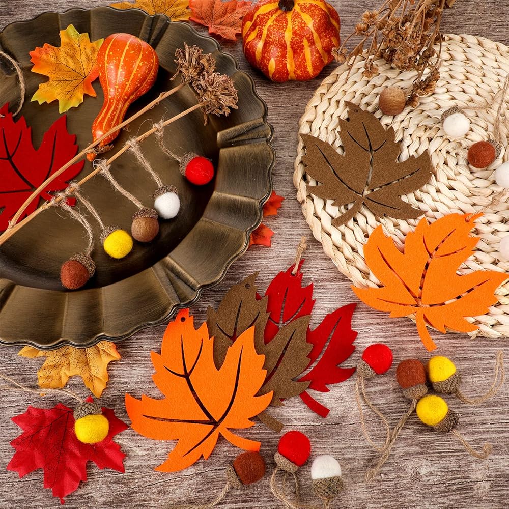 Fall harvest acorn and maple leaf ornaments are cute and soft, equipped with hanging cord, appropriate for adorning your home on Thanksgiving.
