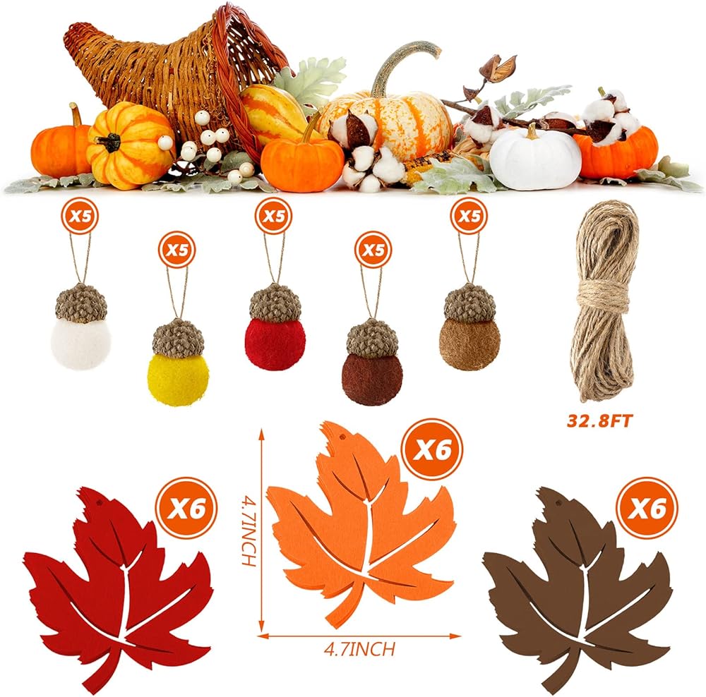 Package content: you will get a set of 43 pieces Thanksgiving felt ornaments, including 25 pieces of felt acorn balls in 5 colors, namely white, red, camel, brown and yellow, 5 pieces of each color, and 18 pieces of maple leaf decorations in 3 colors, red, orange and camel, 6 pieces of each color, sufficient quantity for your daily use and replacement