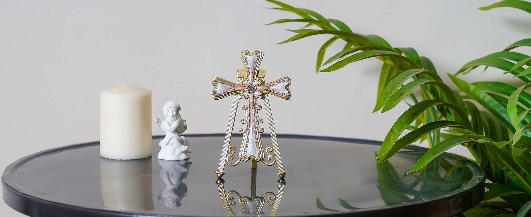 حامل قوي - يضمن الحامل المعدني القوي بقاء هذا الصليب مستقيماً ومستقرًا على أي سطح طاولة أو مكتب، مما يوفر نقطة محورية للصلاة أو التأمل أو ببساطة كقطعة تزيينية.