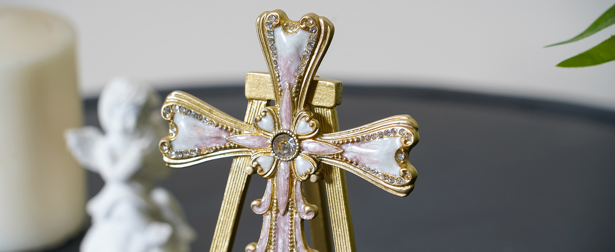 تمثال متقاطع - بمظهر أنيق وفاخر وعتيق وتفاصيل ذهبية كلاسيكية، سيرفع هذا التمثال المتقاطع طاولات الاحتفال الخاصة بك إلى آفاق جديدة؛ كما أنه هدية رائعة للمناسبات الدينية