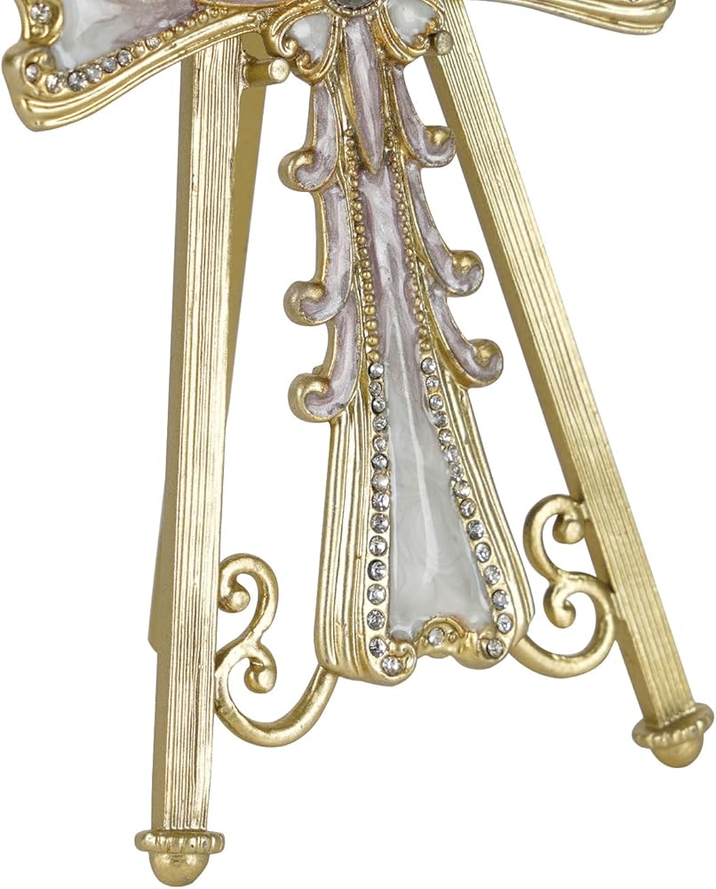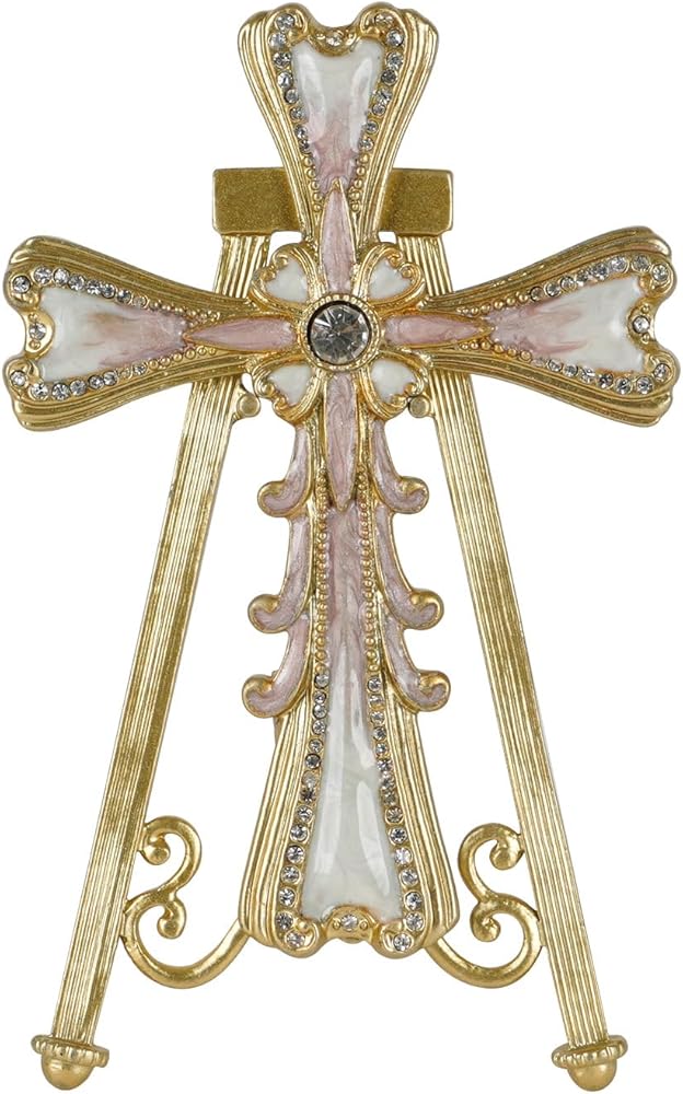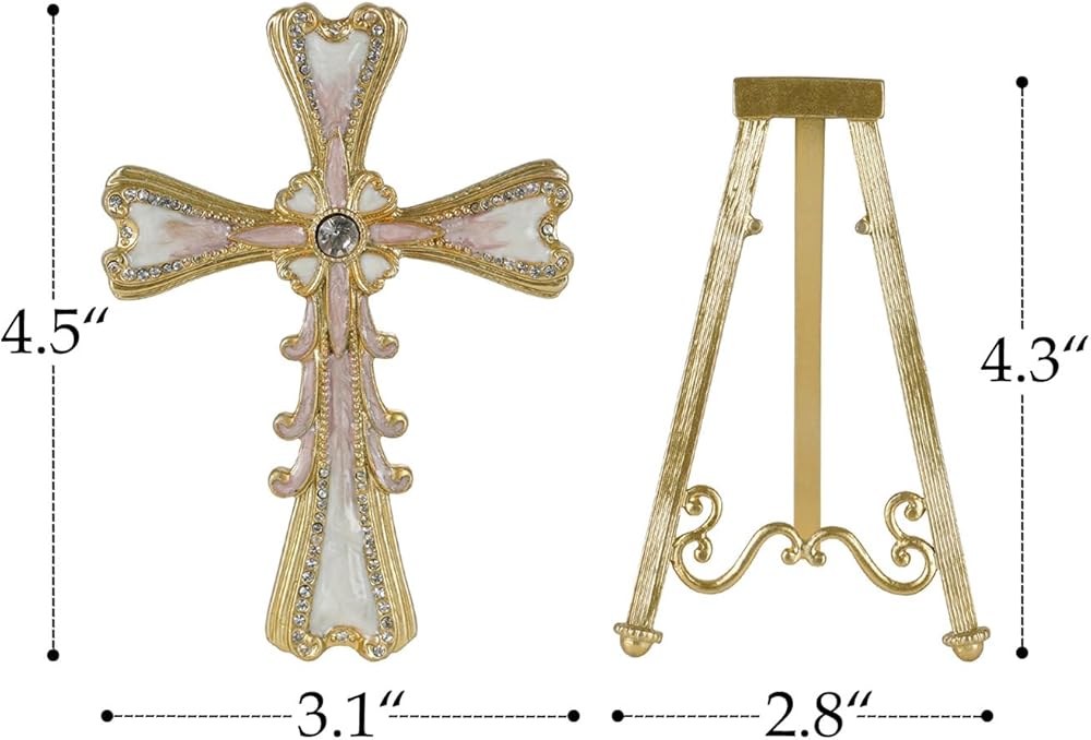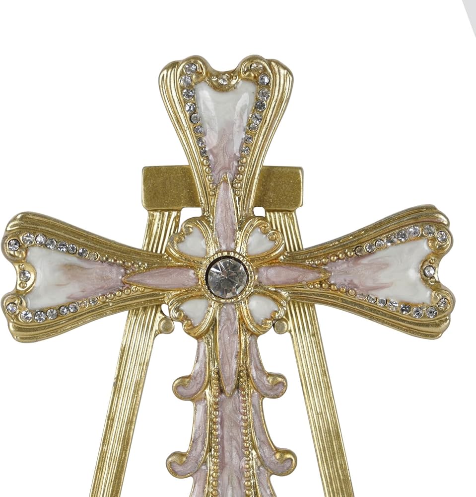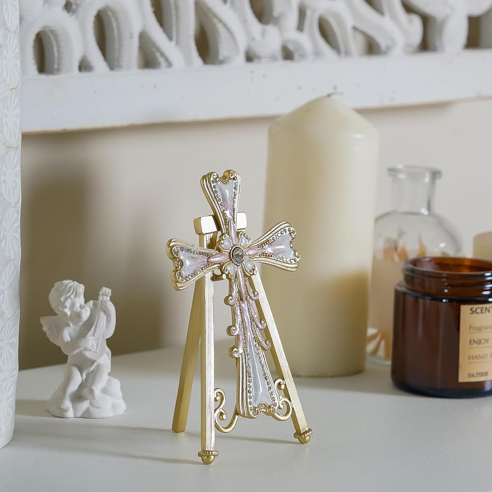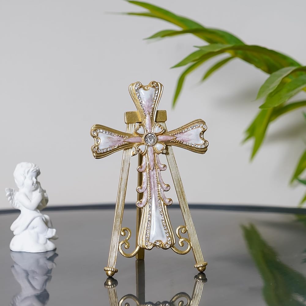 صناعة يدوية جميلة - صليب طاولة يسوع المقدس الفريد مع حامل ذهبي مصنوع من معدن متين عالي الجودة. الصليب مطلي باللون الأبيض والوردي الفاتن، ويتميز بحجر الراين الشفاف الدائري الجميل في المنتصف. تصميم رائع ومصنوع بشكل جيد