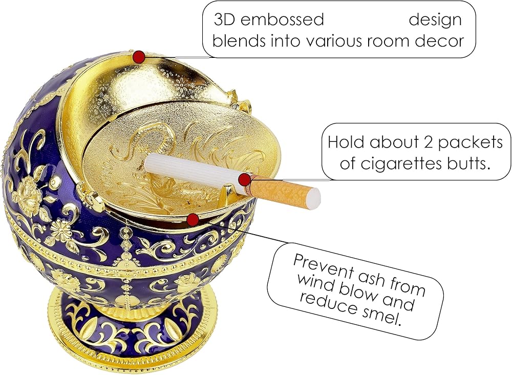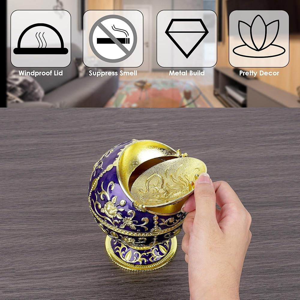 This metal cigarette ashtray with flip lid is made for home, patio, indoor and outdoor use. It is elaborately carved with 3D botanical pattern and a vivid dragon print, making it not only functional but also decorative on tabletops. The large ashtray has a flip lid for specific uses including suppressing smell, preventing wind blow, extinguishing smoke butts. The lid also has a groove to secure cigarette. The lid can be removed so you can clean the ashtray. You can also use this large windproof portable ashtray as a storage box or cone incense burner.