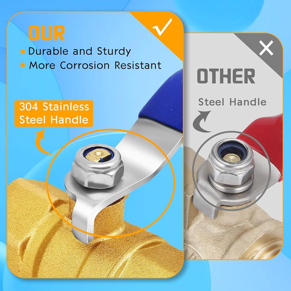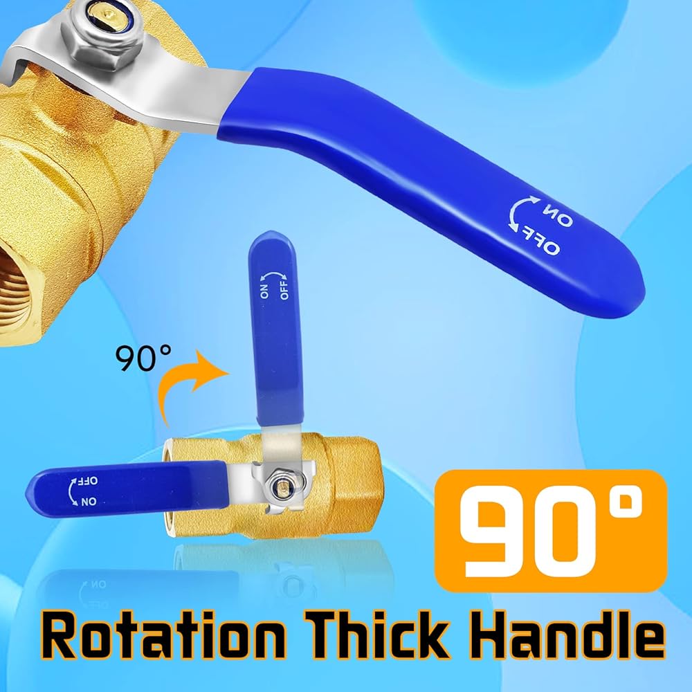 [Material] 1/2'' female ball valve is made of heavy duty brass body, with stainless steel handles (Blue vinyl covered) and stainless steel inner ball, durable and sturdy to use, corrosion resistant, not easy to rust, has a long service life.