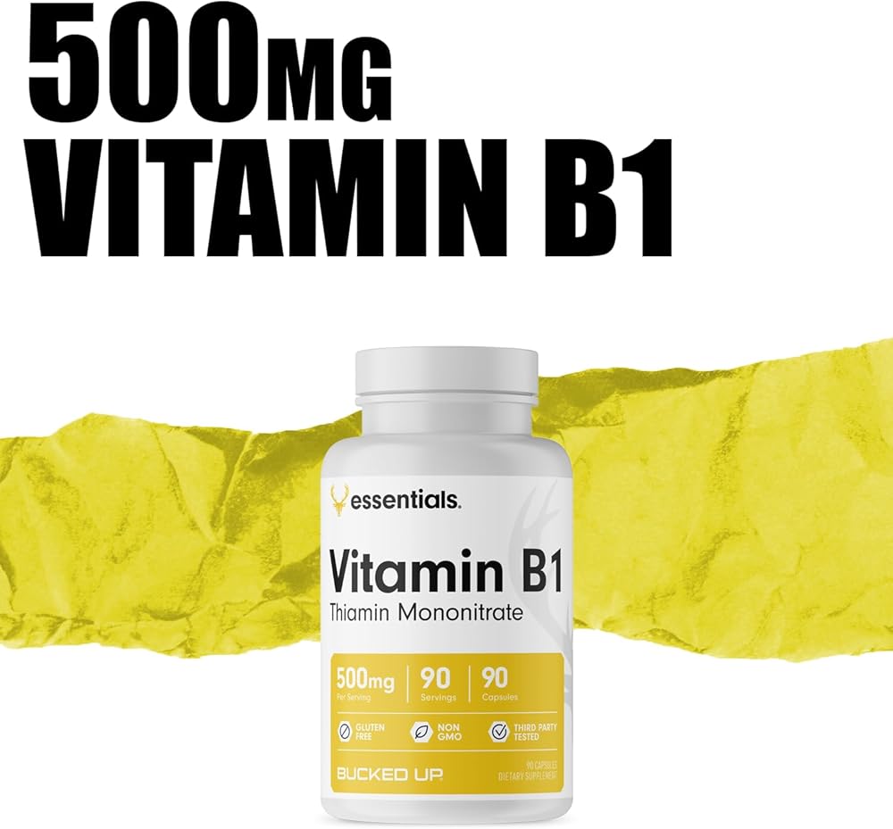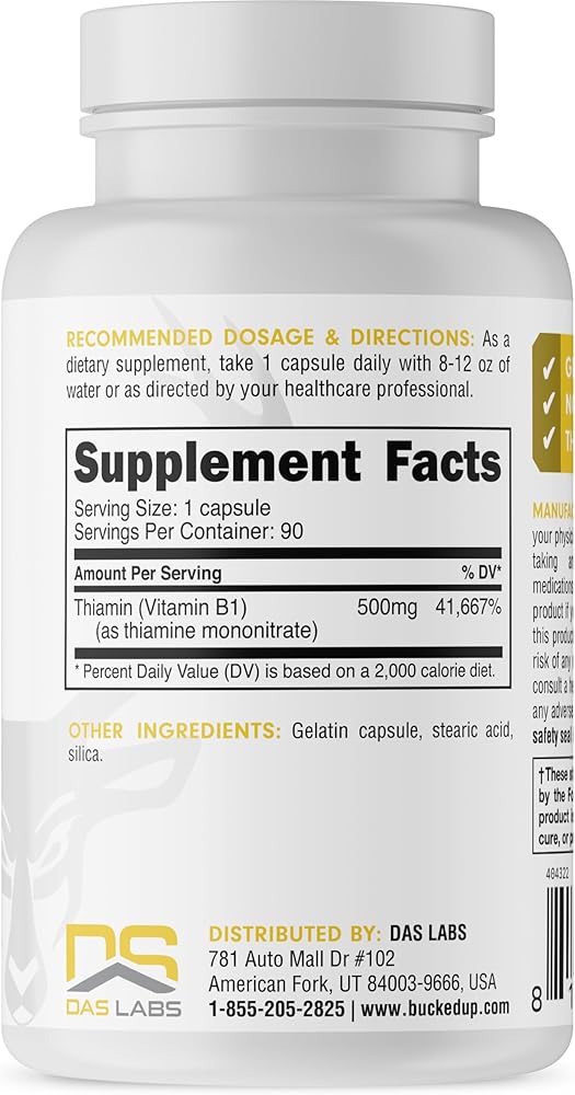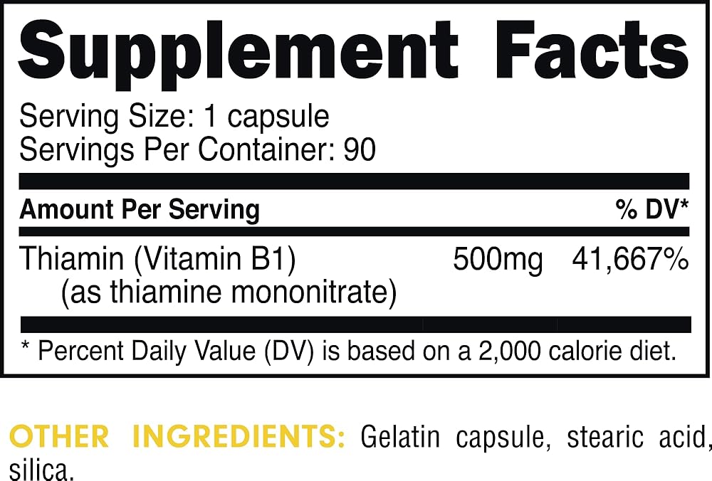 المحتوى والكمية: تحتوي على 90 كبسولة، توفر كل منها 500 ملغ من فيتامين ب1، بإجمالي 90 حصة لكل زجاجة
