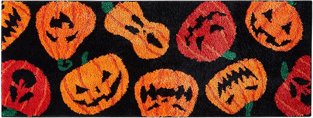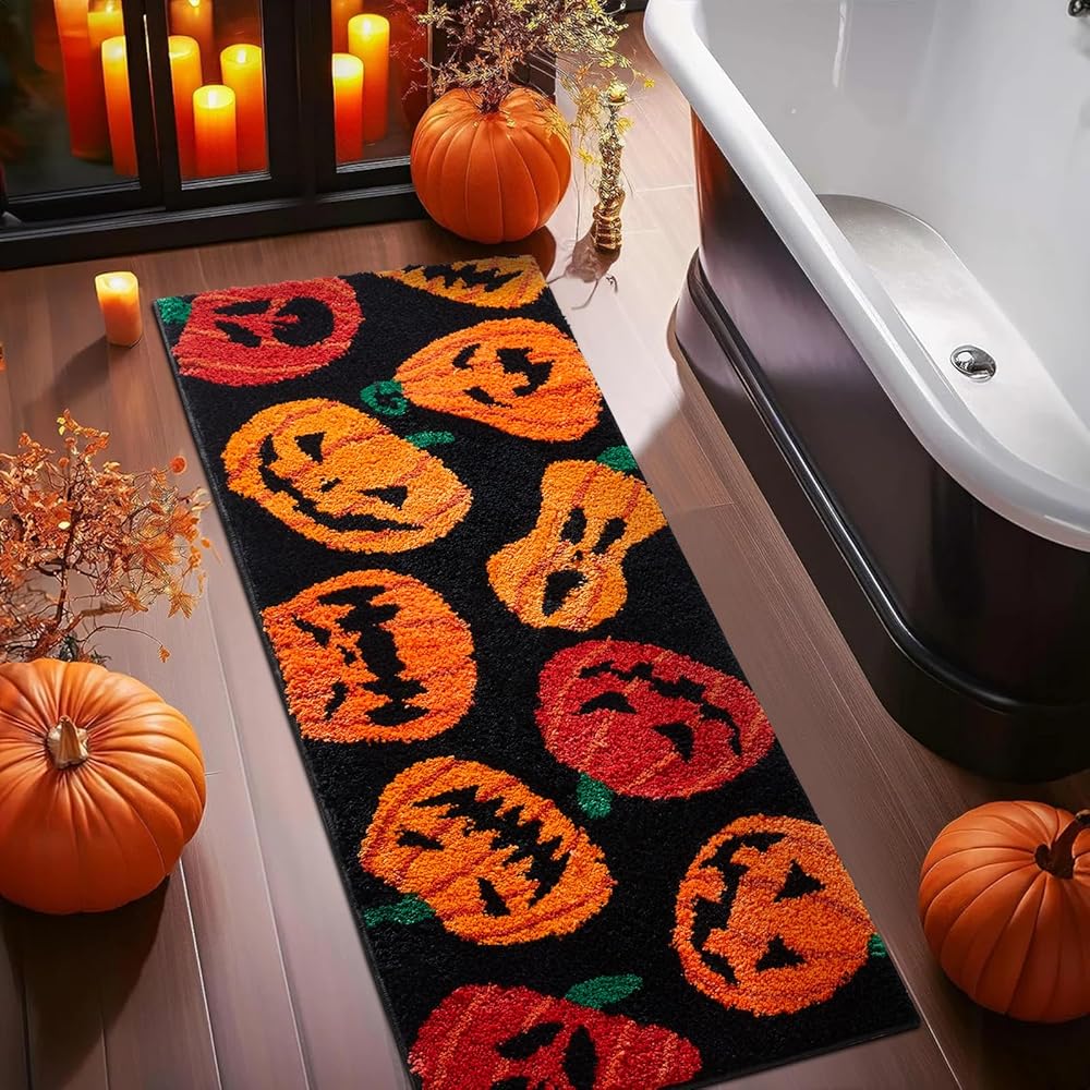 • -- FALL HALLOWEEN PUMPKIN BATHROOM DECOR -- Oh my gourd, Halloween season is upon us! Get the unique Jack O'Lantern Pumpkin Bath runner rug as an impressive home accessory and celebrate Halloween all year long