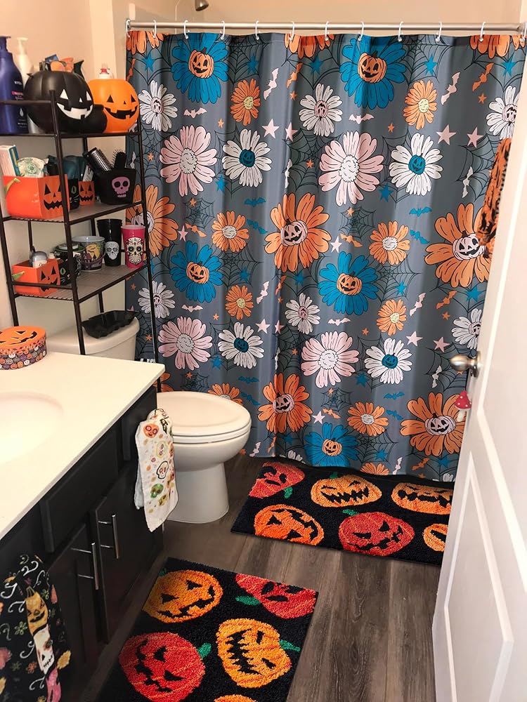 Cute Halloween Bathroom Decorations -- This Jack-O'-Lantern bath rug is sure to add spooky touch to your space.