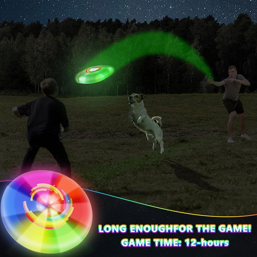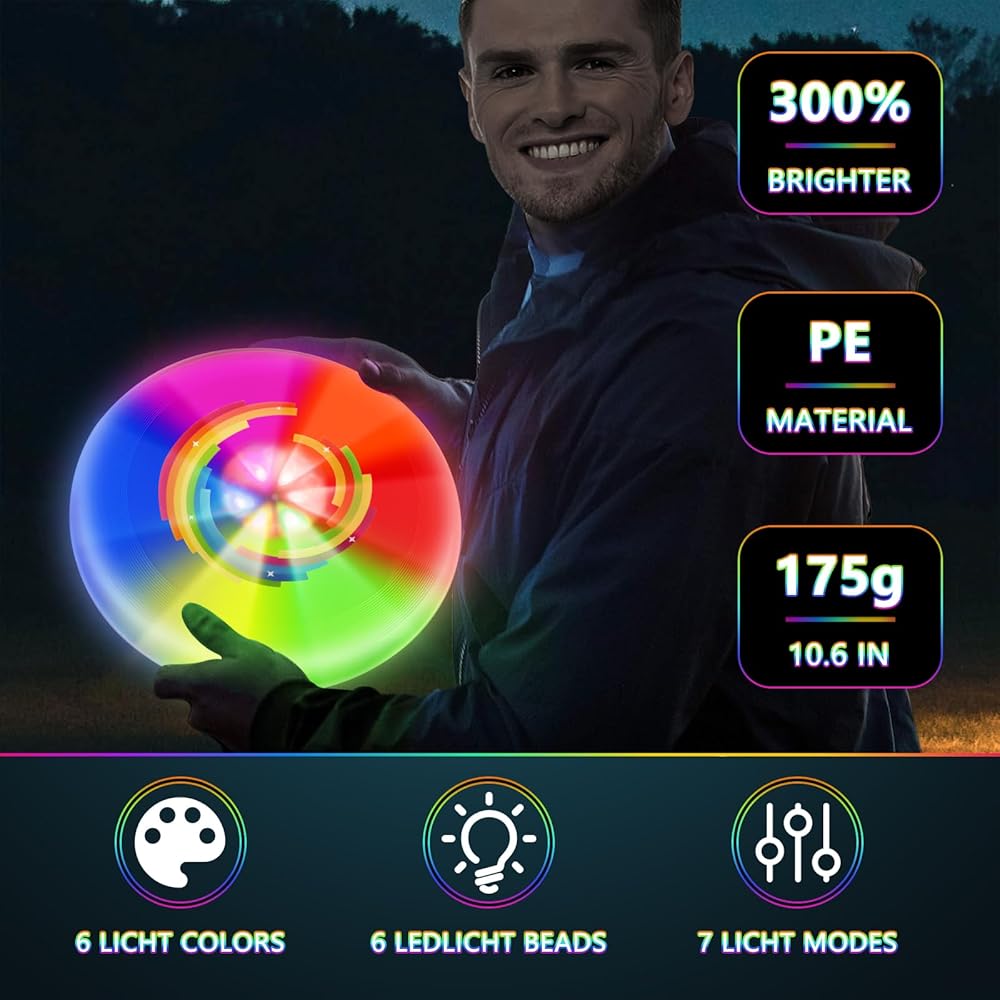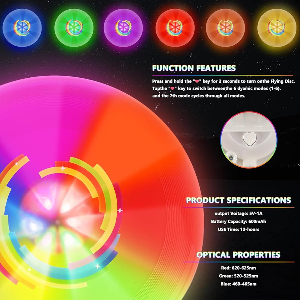 7 أوضاع: يحتوي ضوء القرص الطائر على 7 أوضاع إضاءة، بما في ذلك التركيب، والتدرج، والتنفس، والبهتان البطيء، والفلاش، إلخ. والقرص الطائر المضيء يحتوي على 7 ألوان، بما في ذلك الأحمر والأخضر والأزرق والأصفر والسماوي والأرجواني، وألوان قوس قزح. القرص الطائر الوامض جذاب للغاية في الظلام. يمكنك اللعب في أي وقت وفي أي مكان، والاستمتاع بالوقت مع عائلتك وأصدقائك.