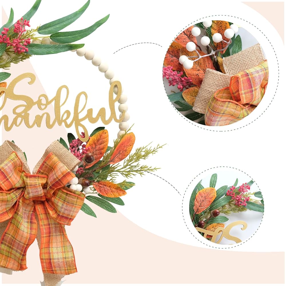 【إكليل خرز خشبي】 إكليل الخرز الخشبي هذا هو تصميم رائع يتميز بخرزات خشبية طبيعية وأوراق خضراء شاحبة ناعمة وتوت أبيض لامع وقوس برتقالي.