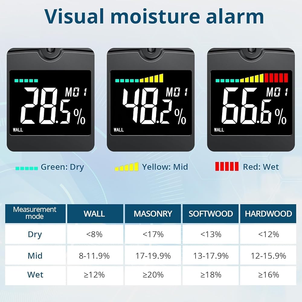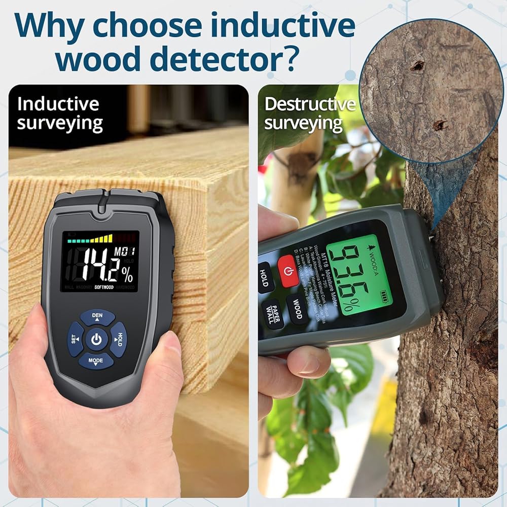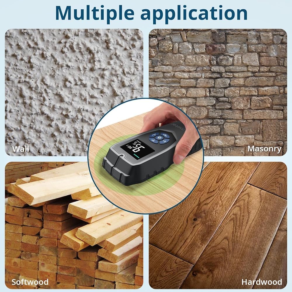 كشف الرطوبة بدون دبوس: يوفر جهاز قياس رطوبة الخشب الخاص بنا قياسًا غير تدخلي وبدون إبرة للخشب. لن يلحق الضرر بالأسطح، مما يجعله مثاليًا للأخشاب ومواد البناء عالية الجودة. يكتشف جهاز قياس الرطوبة هذا الرطوبة من خلال منطقة الاستشعار في الخلف. فهو يوفر قراءات سريعة ودقيقة، مما يوفر الوقت ويحمي المواد الخاصة بك