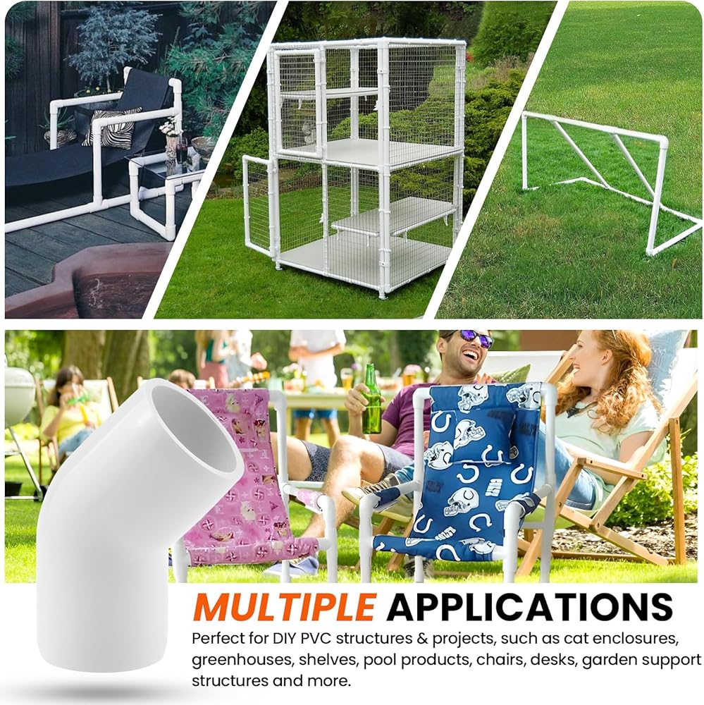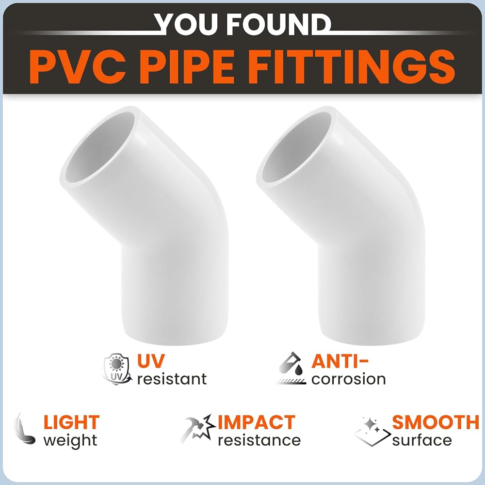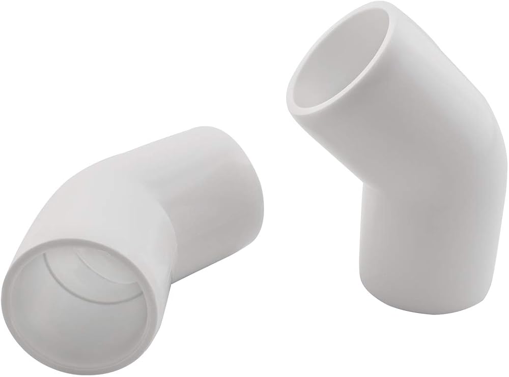 موصلات PVC: تركيبات كوع أنابيب PVC شديدة التحمل بزاوية 45 درجة، لمسة نهائية بيضاء مع مقابس مدببة لتصميم احترافي، مثالية لرسو السفن وتغيير الاتجاه.