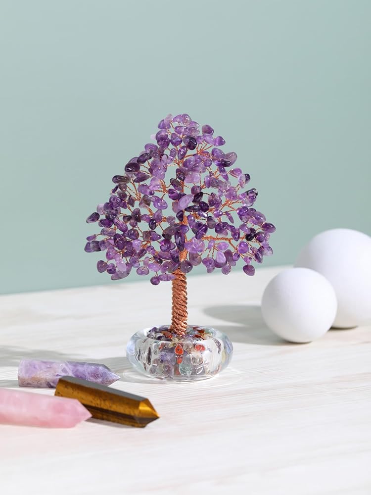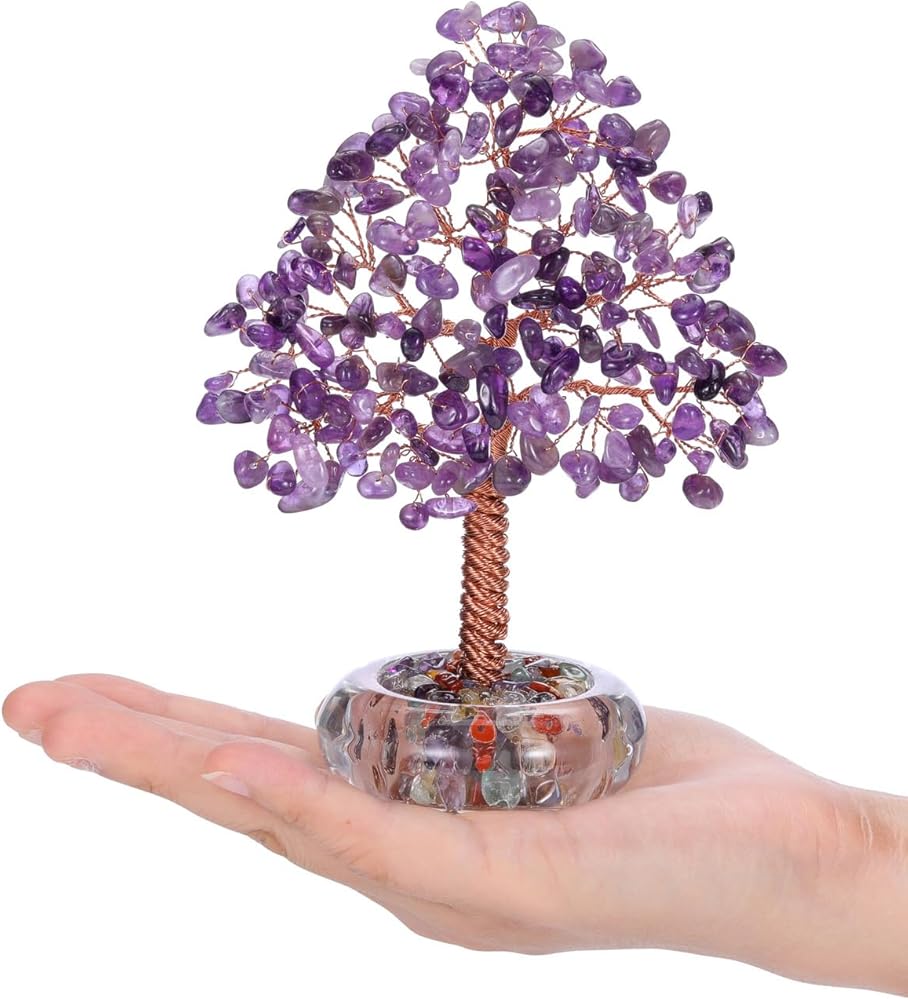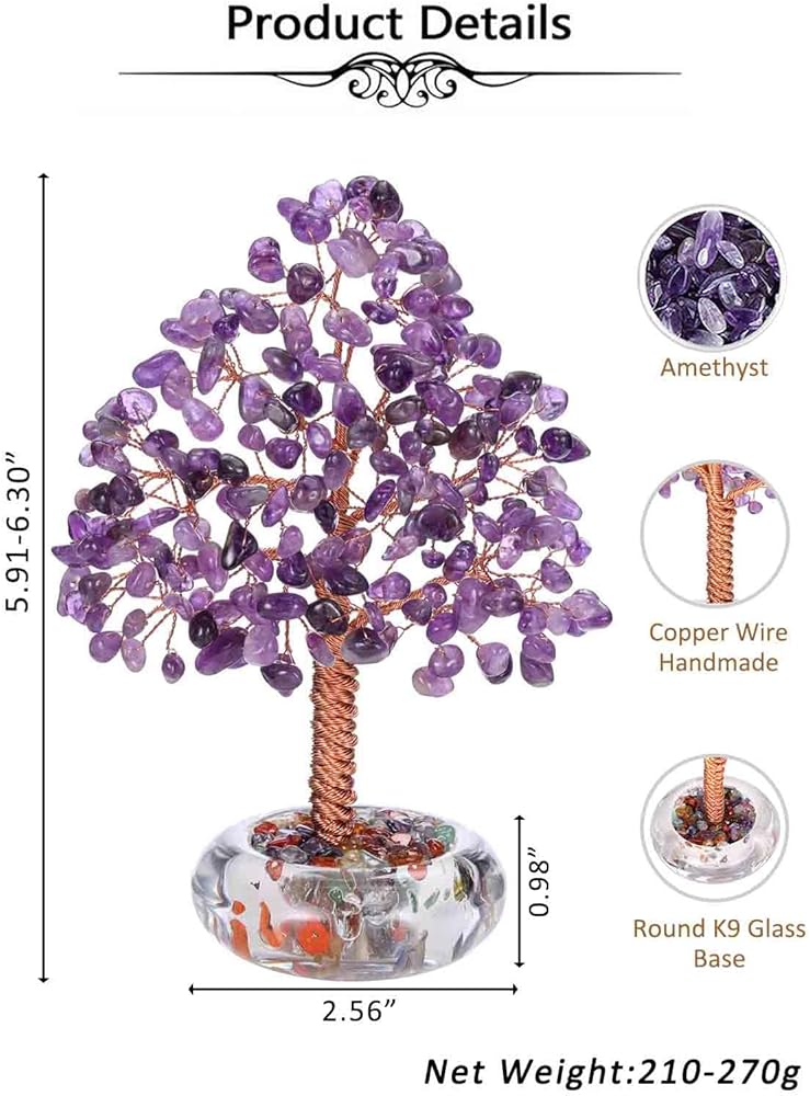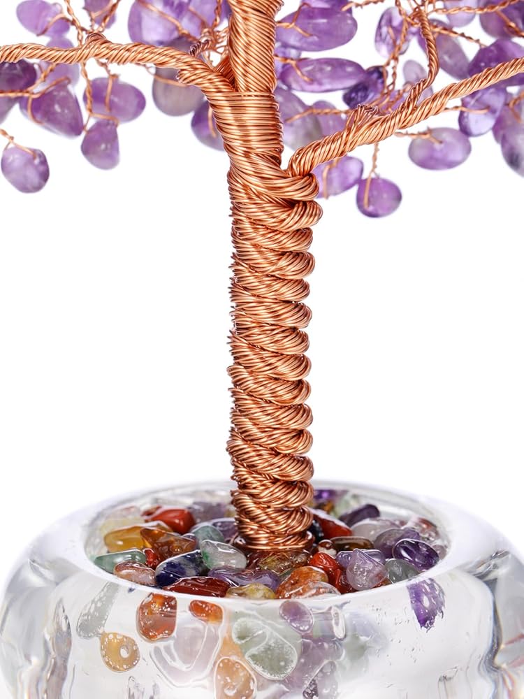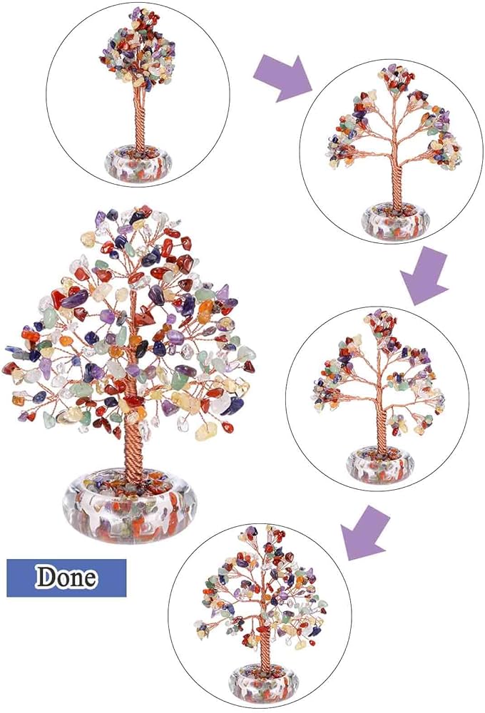 شجرة حجر كريستال: تم تصميم هذه الشجرة الكريستالية المصنوعة يدويًا من حصى الشاكرا المختارة بعناية وملفوفة مع سلك نحاسي لتشكيل الفروع. يوجد في الأسفل زجاج شفاف يحمل بعض رقائق حجر الشاكرا. يجلب الثروة والحظ. جيد لديكور المنزل أو شفاء كريستال الشاكرا. ضعه في غرفة معيشتك أو مكتبك، وسيساعدك على جذب الثروة والازدهار والنجاح وكل الأشياء الجيدة.