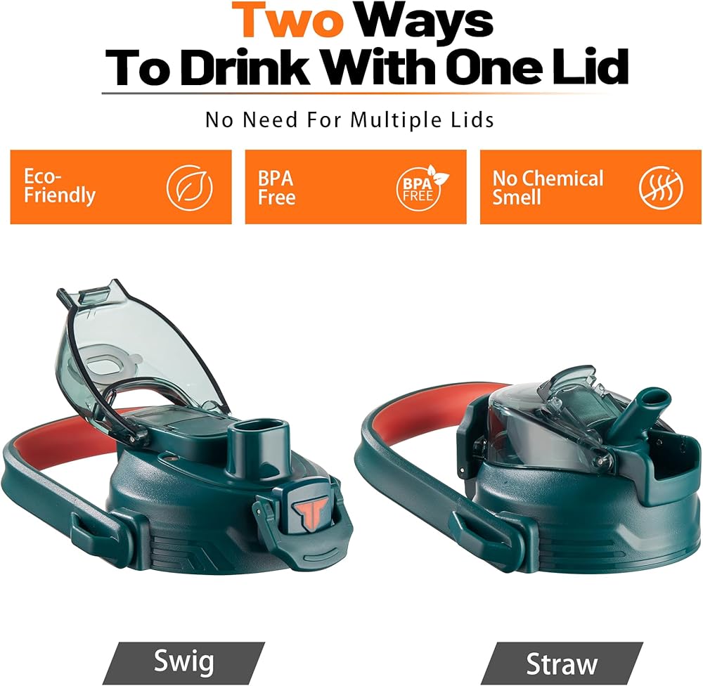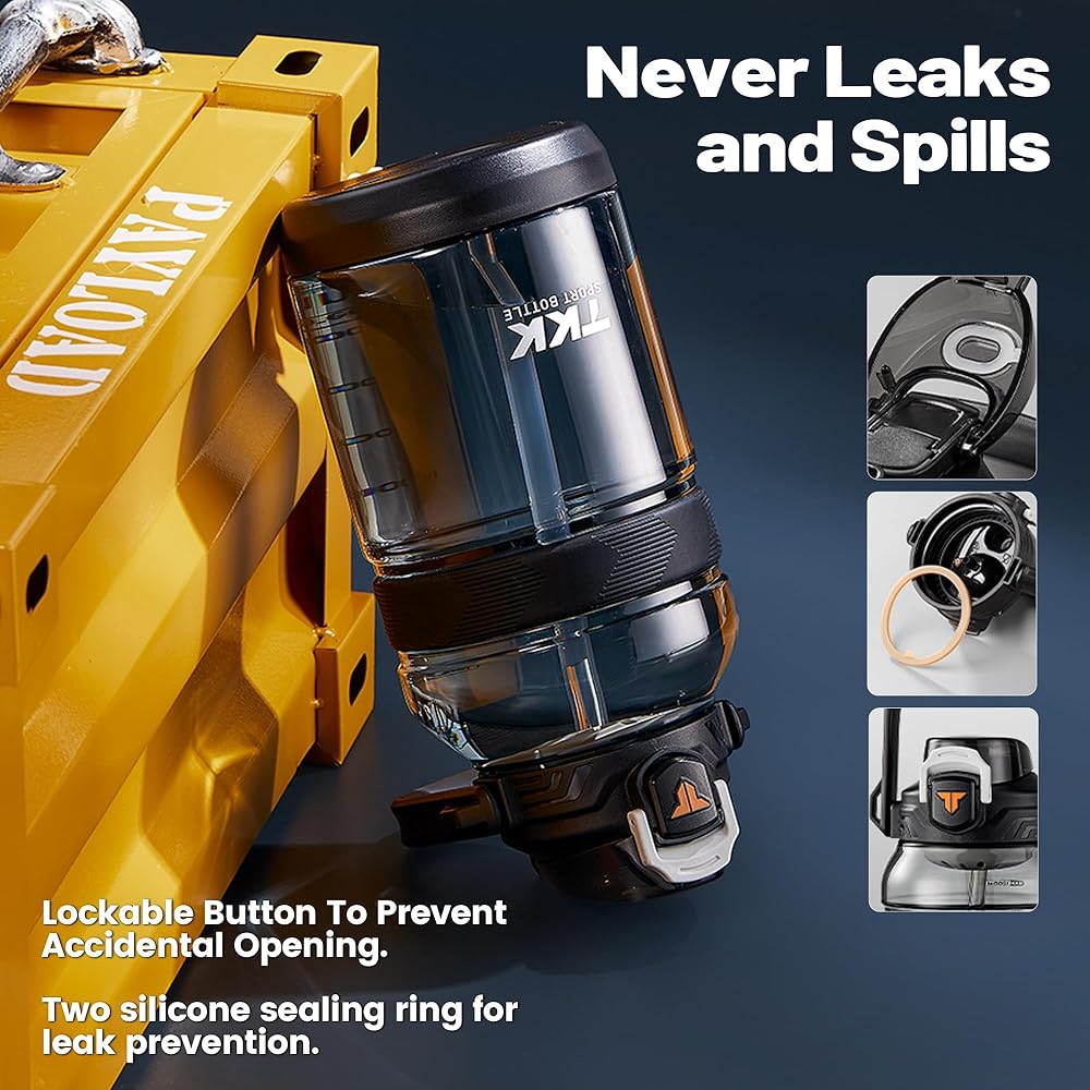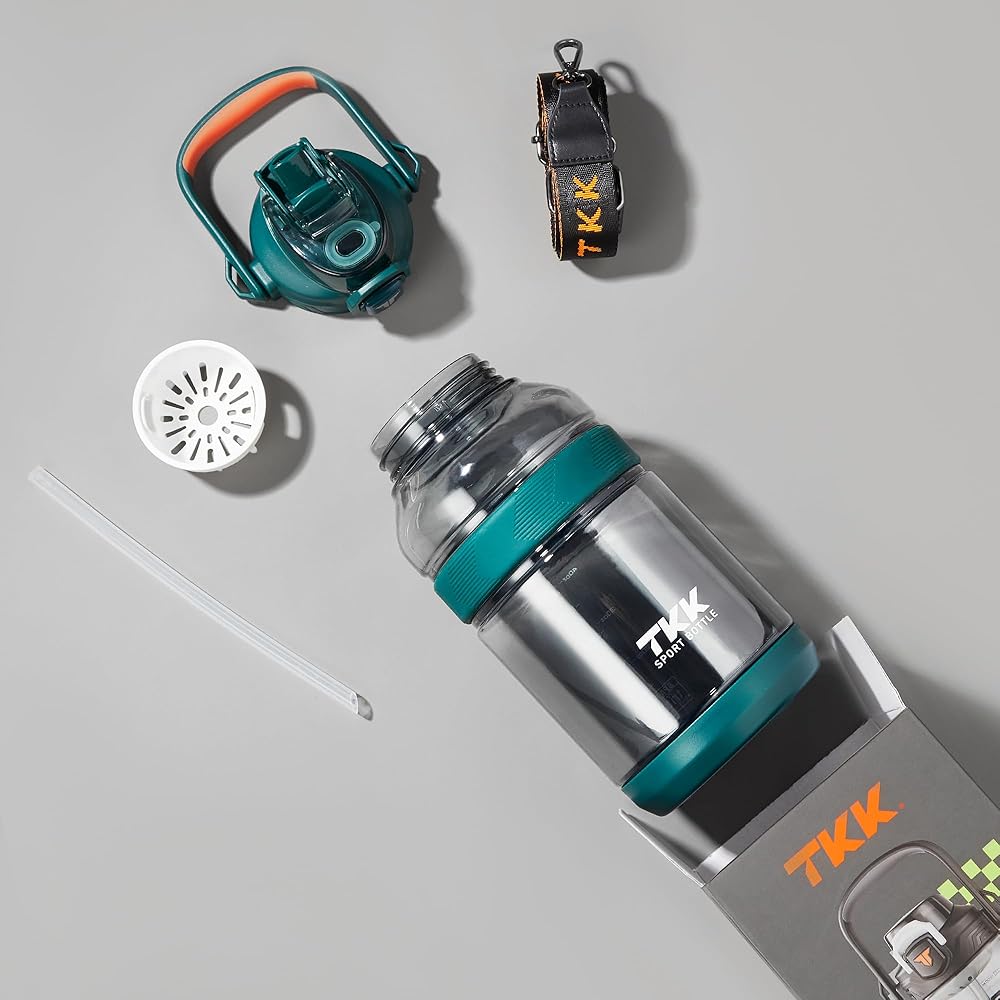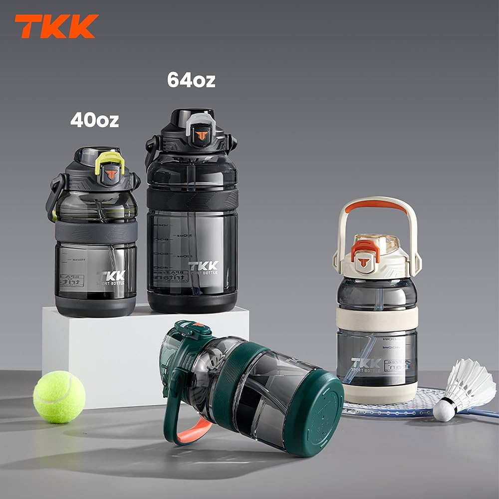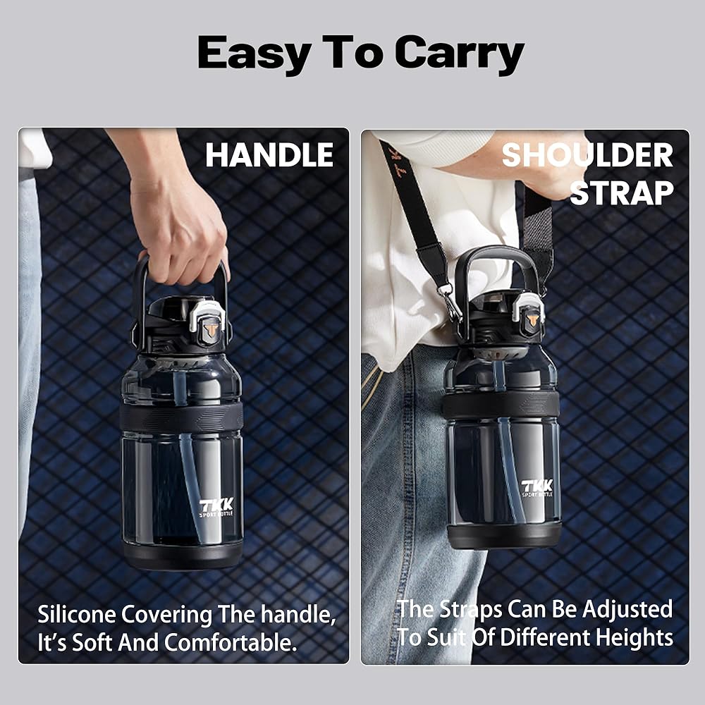 تصميم مريح: زجاجة مياه TKK بسعة 32 أونصة و64 أونصة مريحة جدًا للحمل وتتميز بمقبض مغلف بالسيليكون يوفر قبضة مريحة حتى عند حملها لفترة طويلة. بالإضافة إلى ذلك، تأتي مع حزام كتف قابل للفصل والتعديل يسمح لك بارتداء الزجاجة على ظهرك. الحزام القابل للتعديل يمكن أن يتكيف مع الأشخاص من جميع الأطوال.