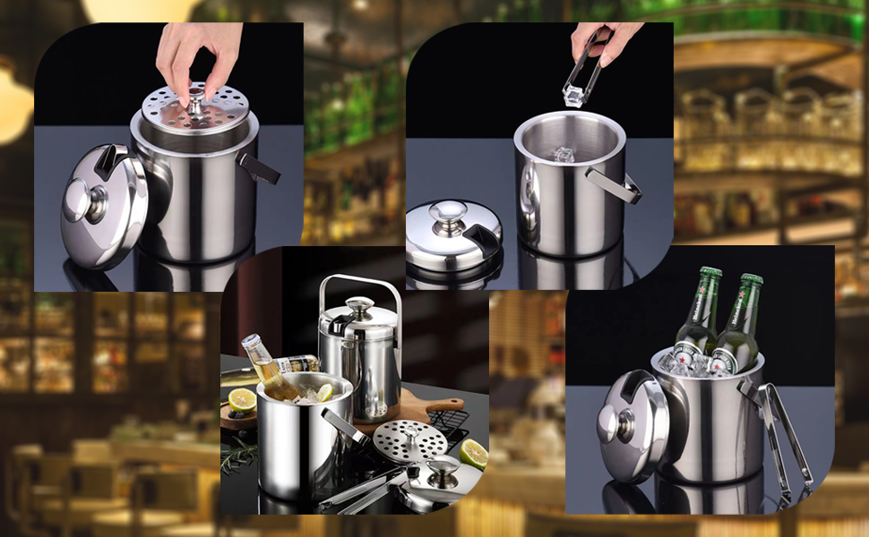 【دلو ثلج مزدوج الجدار 】يبلغ سمك دلو الثلج ميباو 10.5 مم و0.6 بوصة. تم تصميم ثلاث طبقات عزل حراري مستقلة لتحقيق تأثير العزل الحراري. إنها على التوالي طبقة قفل درجة الحرارة، طبقة عازلة للحرارة وطبقة واقية من الفولاذ المقاوم للصدأ 304، وهي مناسبة لتخزين كتل الثلج، الفواكه المجمدة، الشمبانيا، النبيذ، البيرة، إلخ.