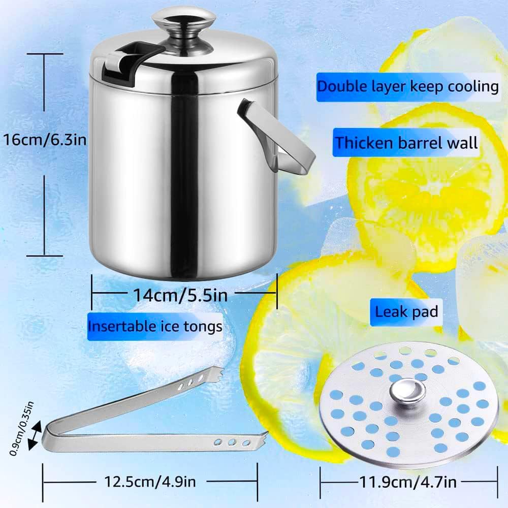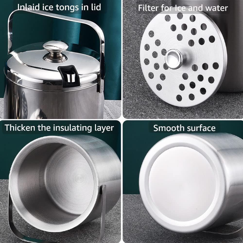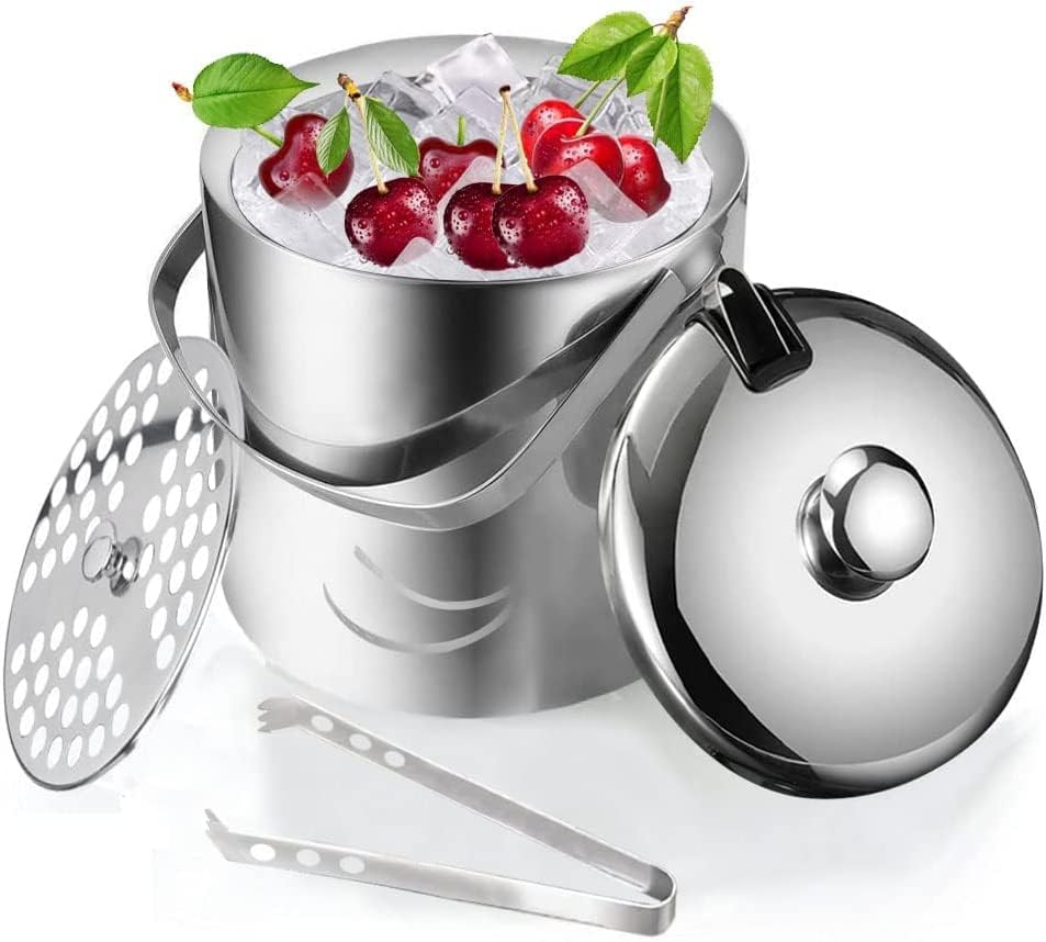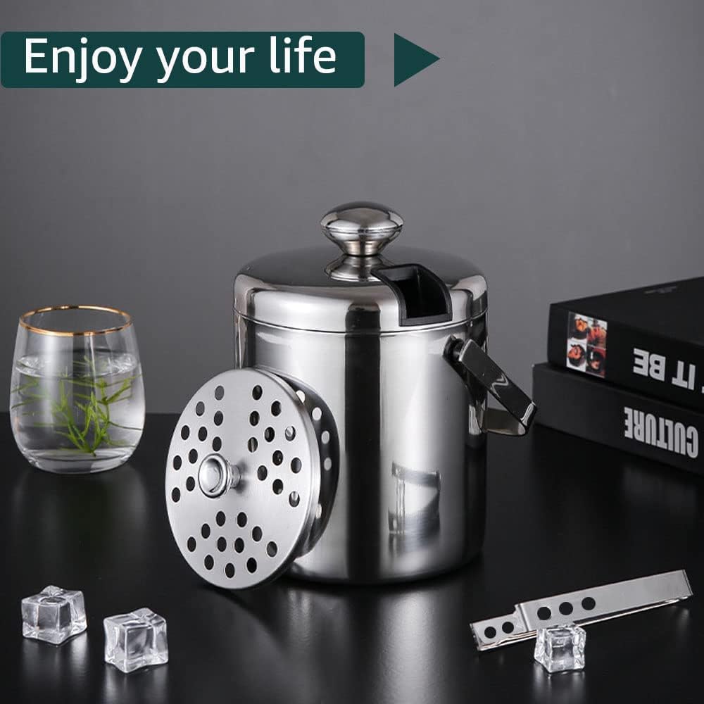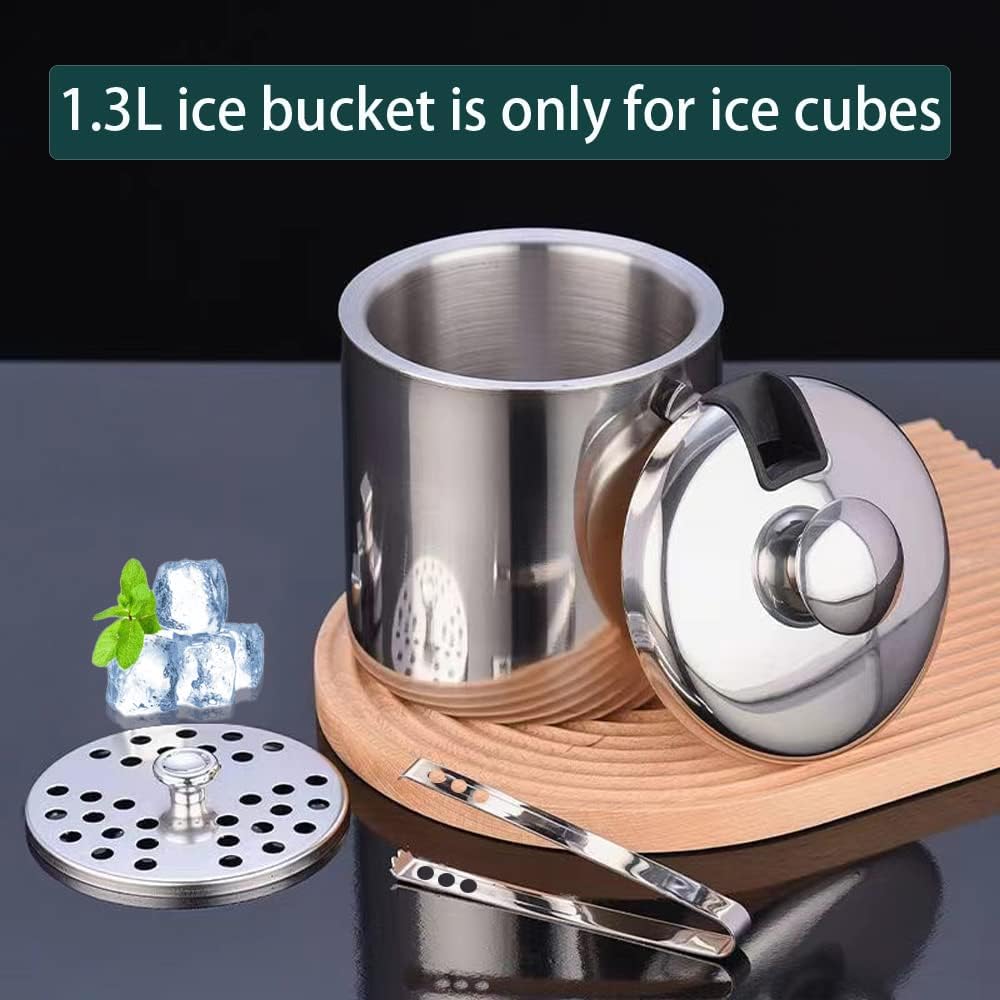 دلو ثلج - دلو ثلج بجدار مزدوج سعة 1.3 لتر مع غطاء، دلو ثلج من الفولاذ المقاوم للصدأ معزول بملقط ومصفاة، مبرد صغير لحفلات المنزل المبردة في بار الويسكي، يحافظ على التبريد لمدة 8 ساعات