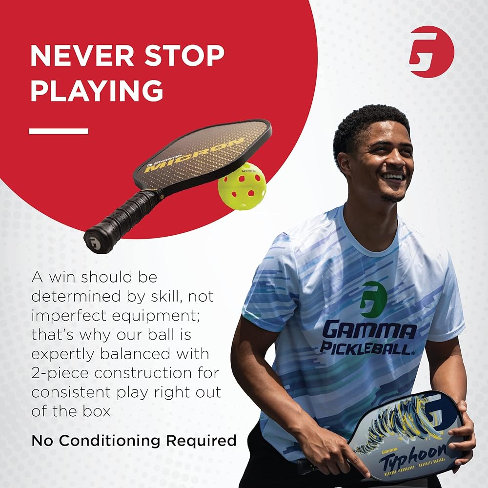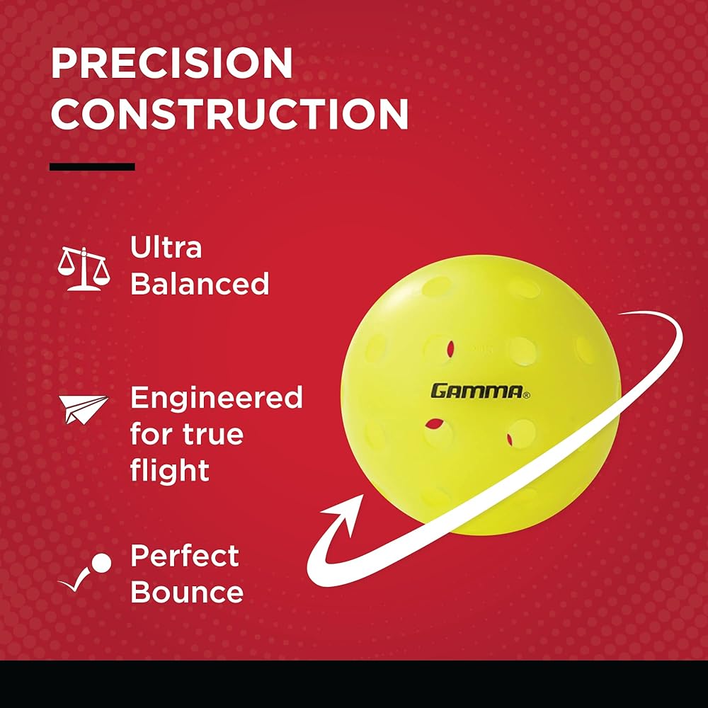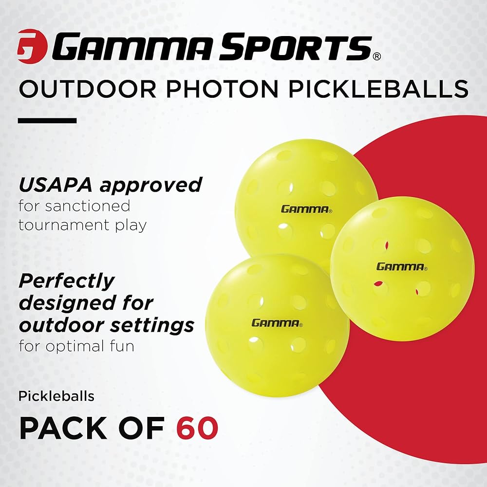 The GAMMA Photon Outdoor pickle ball is engineered for true flight, consistent bounce and long-lasting play. It has a High-Vis Yellow color for clear, crisp visibility in any outdoor environment. USAPA Approved for sanctioned play.