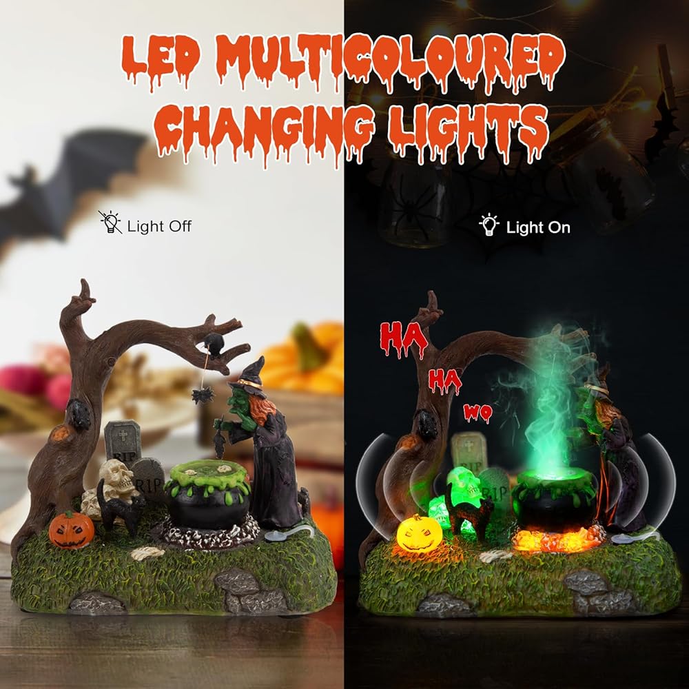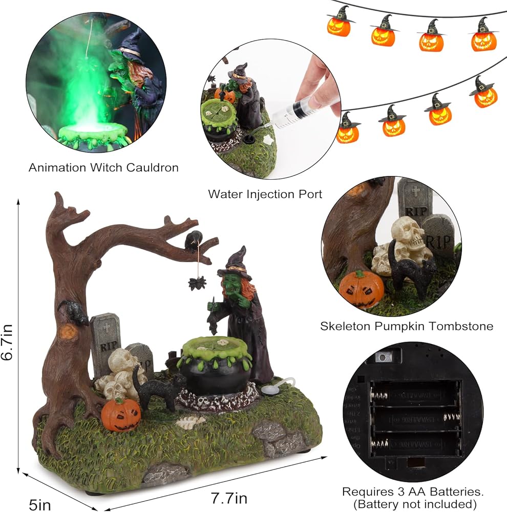 Halloween Decorations H 6.7" Halloween Village Witch & Cauldron Decor Built-in Mini Mist Maker with Sound Control for Indoor Halloween Decoration, Birthday Gift, Vintage Decor