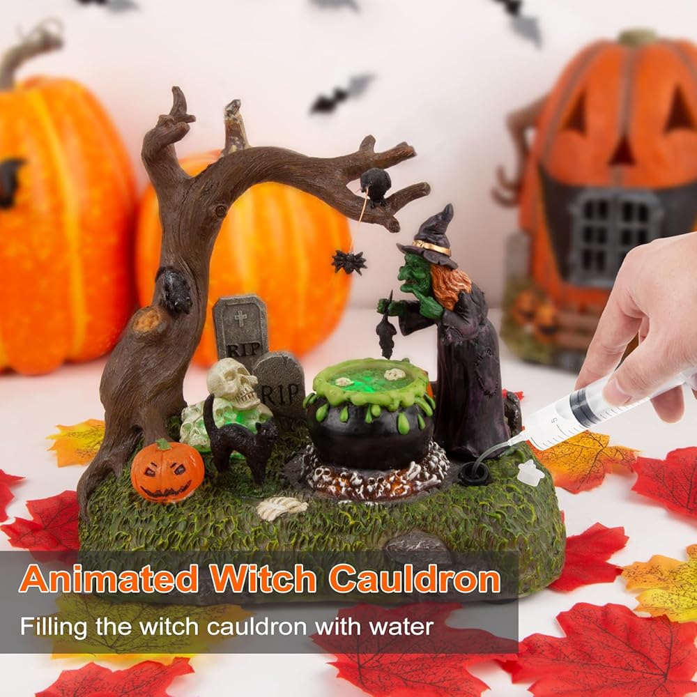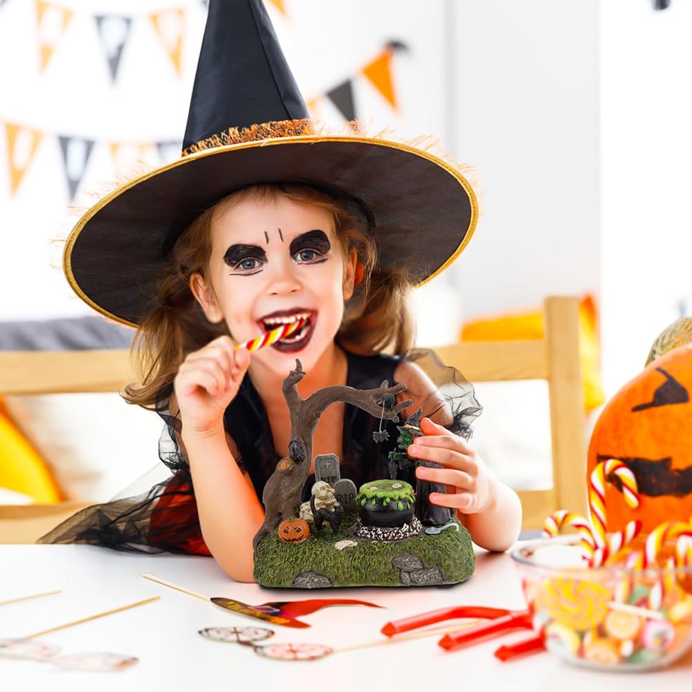 Halloween Village Series - Witch's Cauldron: This is a classic Halloween Village desktop statue, based on the witch and her cauldron, incorporating elements such as Halloween skulls, tombstones, pumpkins, dead trees, black cats, etc., which both attracts It's eye-catching and in line with the spirit of Halloween.