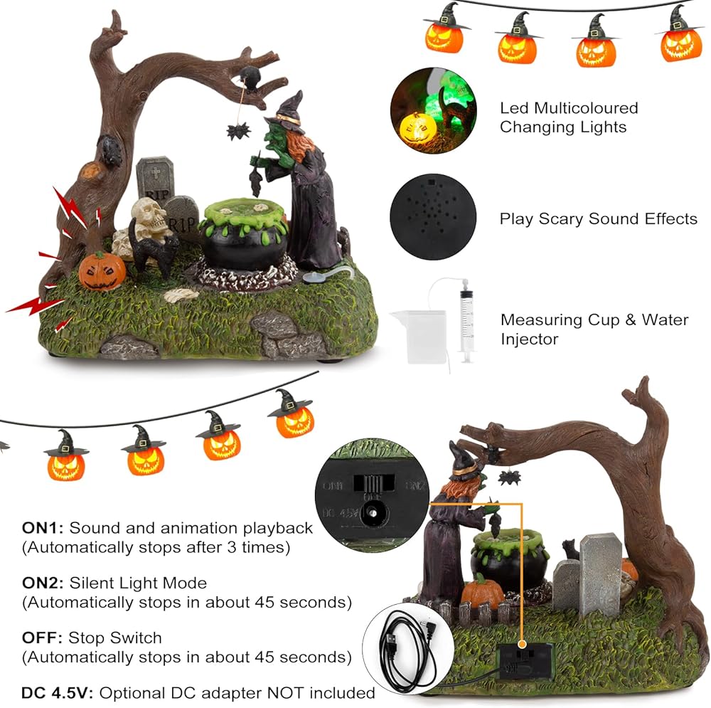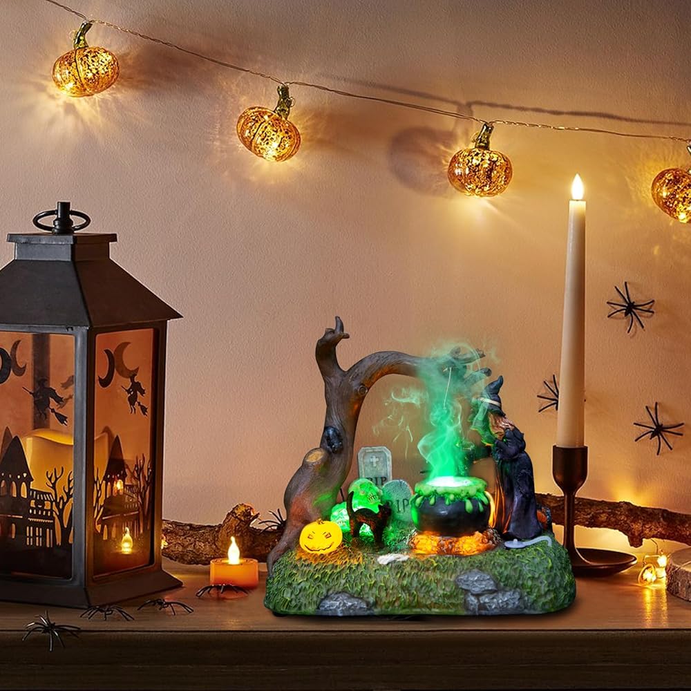 Halloween Cauldron - Mist Maker: This Halloween witch figurine exudes a strong festive atmosphere. Just add water to the witch's cauldron to produce smoke, and the eerie sound and the witch holding a mouse all highlight its unique charm. It will be a highlight of this year's Halloween party.