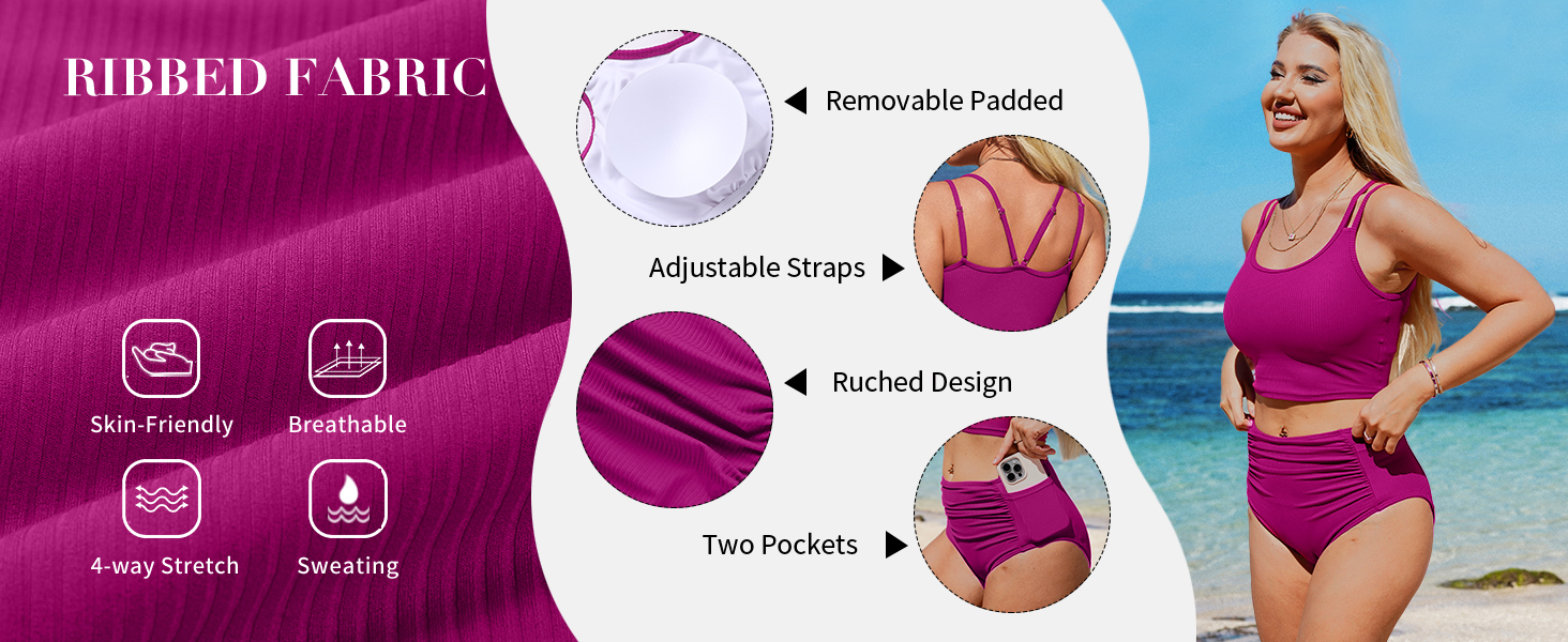 الجزء السفلي من بيكيني عالي الخصر: الجزء السفلي من بدلة السباحة يتميز بتصميم مكشكش في الأمام مما يساعد على تغطية منطقة البطن وهو رائع لإضفاء مظهر جذاب، الجزء السفلي للسباحة يحتوي على جيبين جانبيين لتخزين المفاتيح أو الهاتف