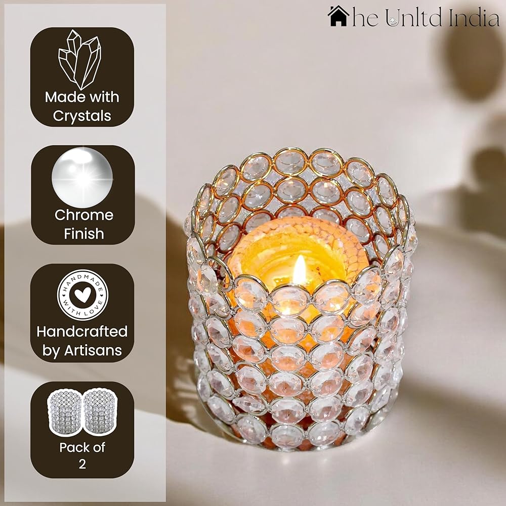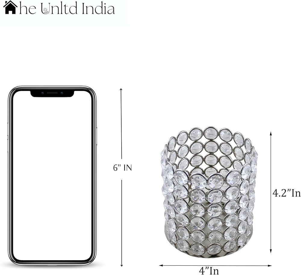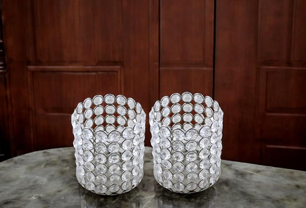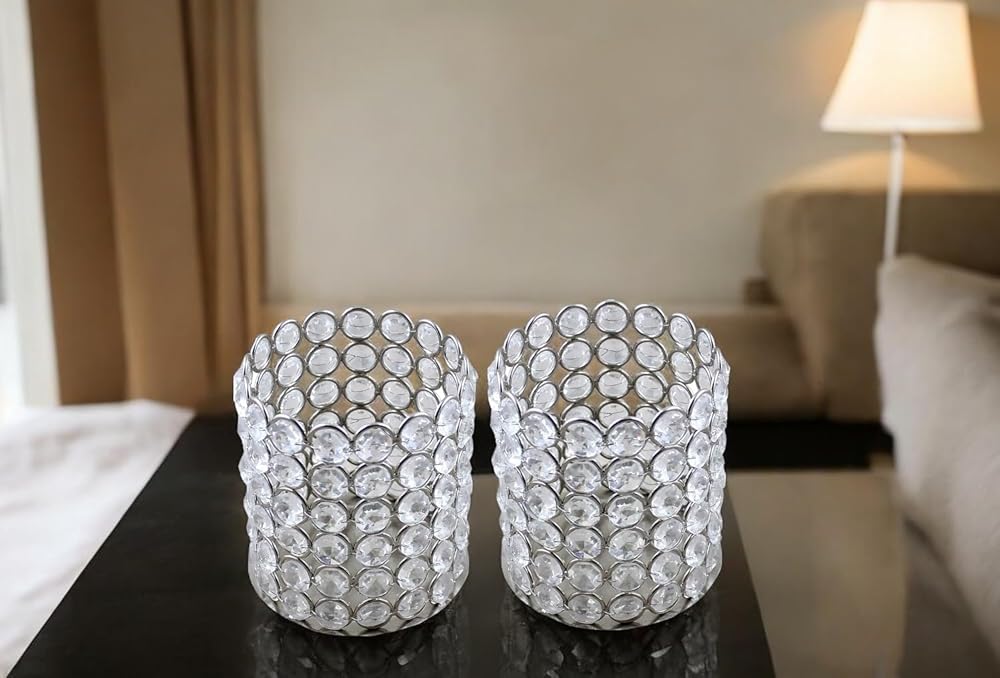 Candle Holders :Indulge in the allure of these two silver crystal tea light candle holders, each measuring 4 inches in diameter and 4.2 inches in height (candles not included). Perfectly crafted for tea lamp candles, these holders effortlessly enhance any ambiance with their elegant design.
