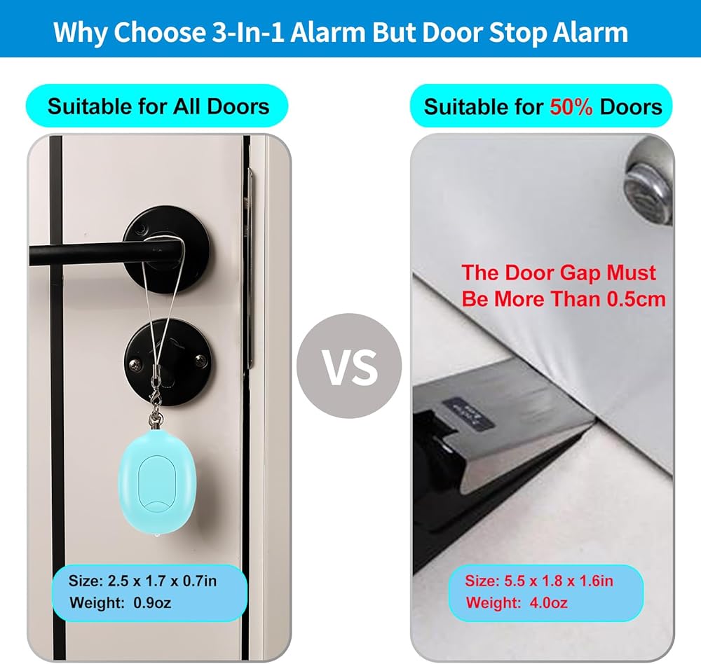 إنذار 3 في 1: يعمل كإنذار لفتح الباب، وإنذار ضد سرقة الأمتعة، وإنذار للسلامة الشخصية للدفاع عن النفس. عندما يتم تشغيل المنبه، فإنه يصدر صفارة صوت عالية جدًا تبلغ 130 ديسيبل وضوء وامض يعمي البصر.