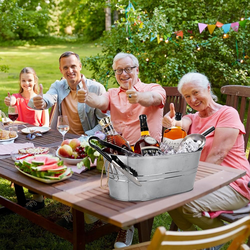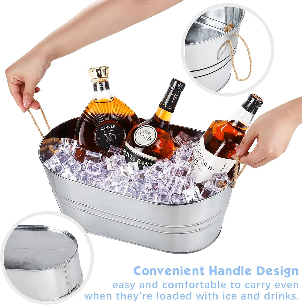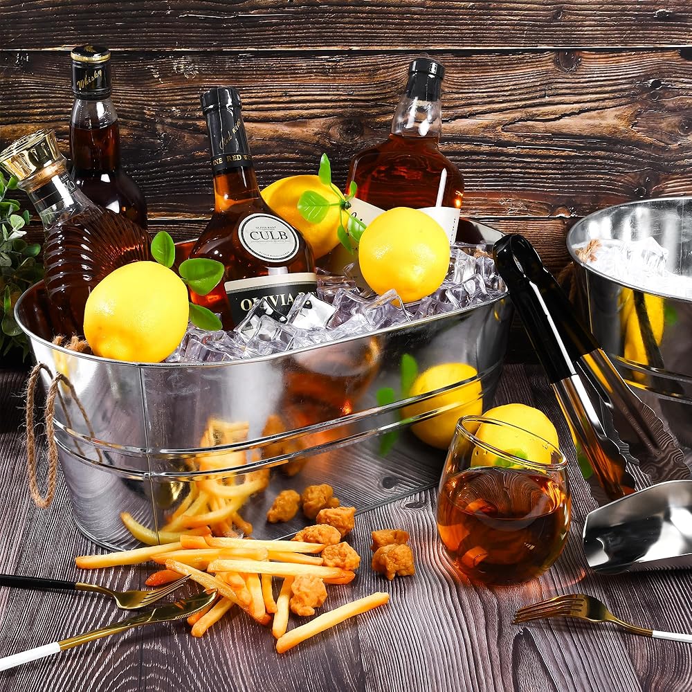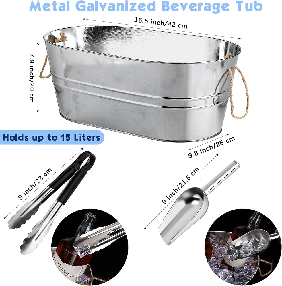 سوف تحصل على: 4 أحواض مشروبات مجلفنة، و4 مغارف ثلج، و4 ملقط من الفولاذ المقاوم للصدأ، يبلغ حجم حوض المشروبات المعدني المجلفن حوالي 16.5 × 9.8 × 7.9 بوصة / 42 × 25 × 20 سم ويتحمل ما يصل إلى 15 لترًا، بسعة كافية و كمية وفيرة لتلبية احتياجات الاستخدام والاستبدال في حفلتك، كما أنها جيدة لمشاركتها مع الآخرين، دعنا نستمتع بوقت سعيد!