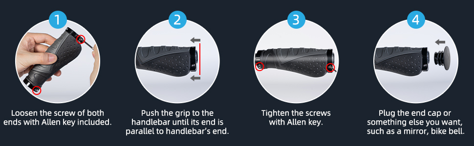 【 سهلة التركيب 】هل من الصعب تركيبها وإزالتها؟ لا، مقابض مقبض الدراجة تأتي مع مفتاح ألين للإزالة والتركيب السريع. يتطلب التثبيت 4 خطوات فقط. من السهل جدا!