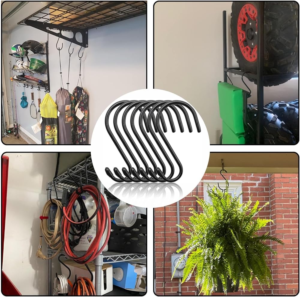 【Easy to Use】These hanging hooks it doesn't need to use tools,nails, screws, you can hang them on racks, bars, shelves,rod and place in closet,kitchen,garage,bathroom,garden and etc,large vinyl coated s hooks can hang lots of item to help you save more space,are a simple and friendly solution