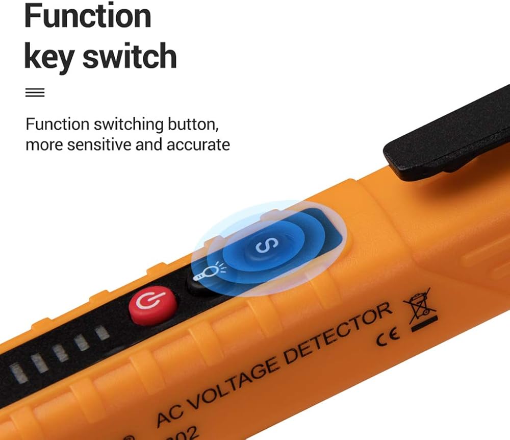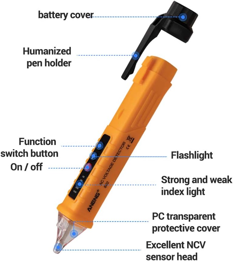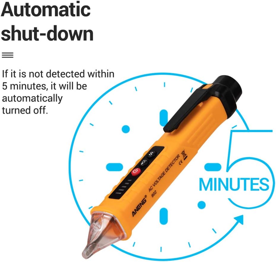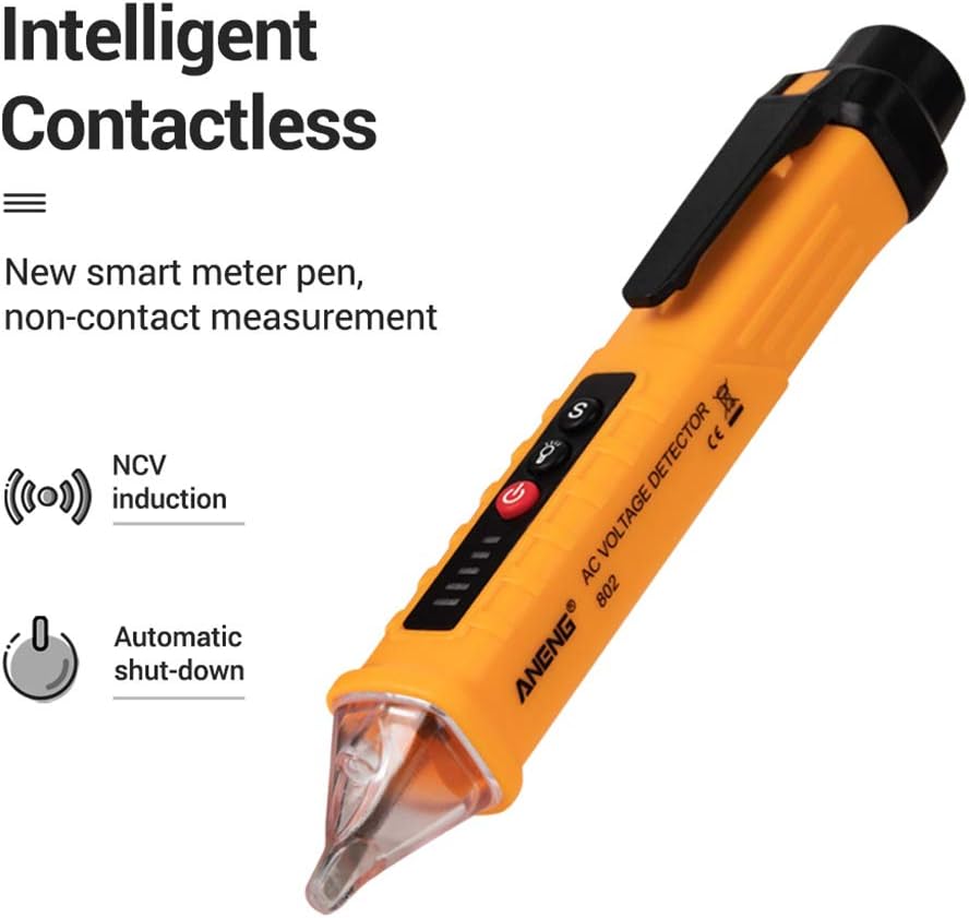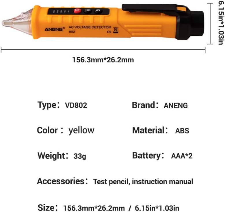 Non-contact AC Voltage Detector Tester Meter 12V-1000v Pen Style Electric Indicator LED Outlet Voltage Dectetor Specifications: 1. Operating Temperature:040¡ã 2. Display Type: Digital Only 3. Dimensions: 156 x 20 x 20mm 4. Accuracy Class: Class III 5. Model: AC10 6. Power Supply: 2 x 1.5V AAA Batteries(Not Included) 7. Flash light: Yes 8. Alarm mode: Sound and Light 9. Probe Shape: Prolate 10. NCV Sensitivity:High,Medium,Low 11. Weight:Approx. 43g 12.Non-contact AC Voltage Tester 13. Measuring Range:121000V Notice The starting default AC voltage detection range of the tester: About 48?lOOOV. Press the AC voltage detection range switching button (S), the detection range indicator lights up, and the detectable voltage range of the tester is about 12?1000V. Press the AC voltage detection range switching button (S) again, the detection range indicator lights off, and the detectable voltage range of the tester is about 48?lOOOv. Automatic shutdown function When there's no operation of the tester and there's no voltage signal detected by the tester within 5 minutes, the tester will power off automatically. Battery undervoltage indication When the battery voltage is lower than about 2.6V, the power indi cator flashes for 3 times,while the buzzer makes a sound and then turns off. Please replace the battery timely. Package includes: 1 x AC Voltage Tester