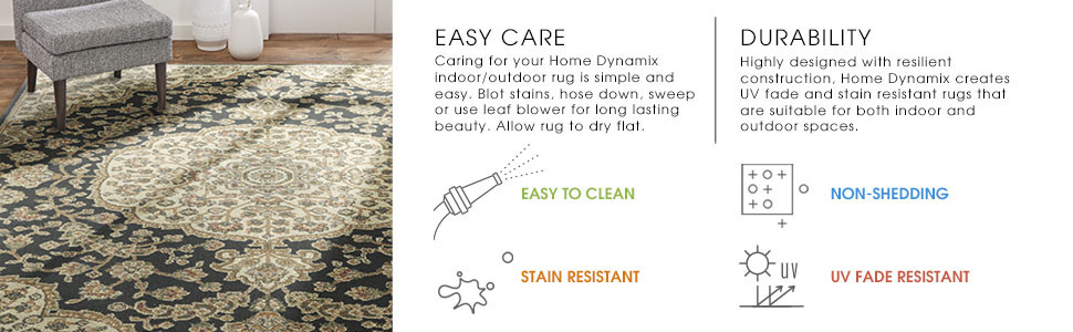 EASY CARE: The easy to clean polypropylene is fade and stain-resistant and easy to maintain. Simply refresh your area rug by shaking out dust, dirt, and debris, spot cleaning, or vacuuming as needed.